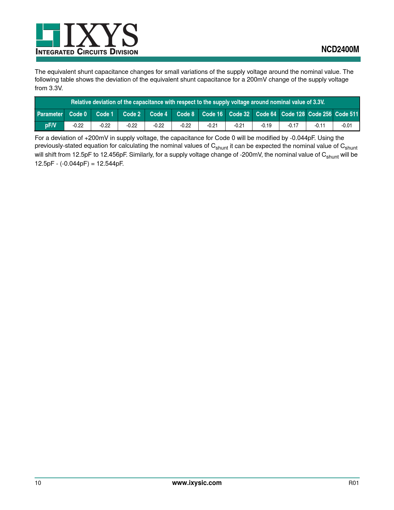 -0.22 -0.22 -0.22 -0.22 -0.22 -0.21 -0.21 -0.19 -0.17 -0.11 -0.01 For a deviation of +200mV in supply voltage, the capacitance for Code 0 will be modified by -0.044pF. Using the previously-stated equation for calculating the nominal values of Cshunt it can be expected the nominal value of Cshunt will shift from 12.5pF to 12.456pF. Similarly, for a supply voltage change of -200mV, the nominal value of Cshunt will be 12.5pF - (-0.044pF) = 12.544pF. 10