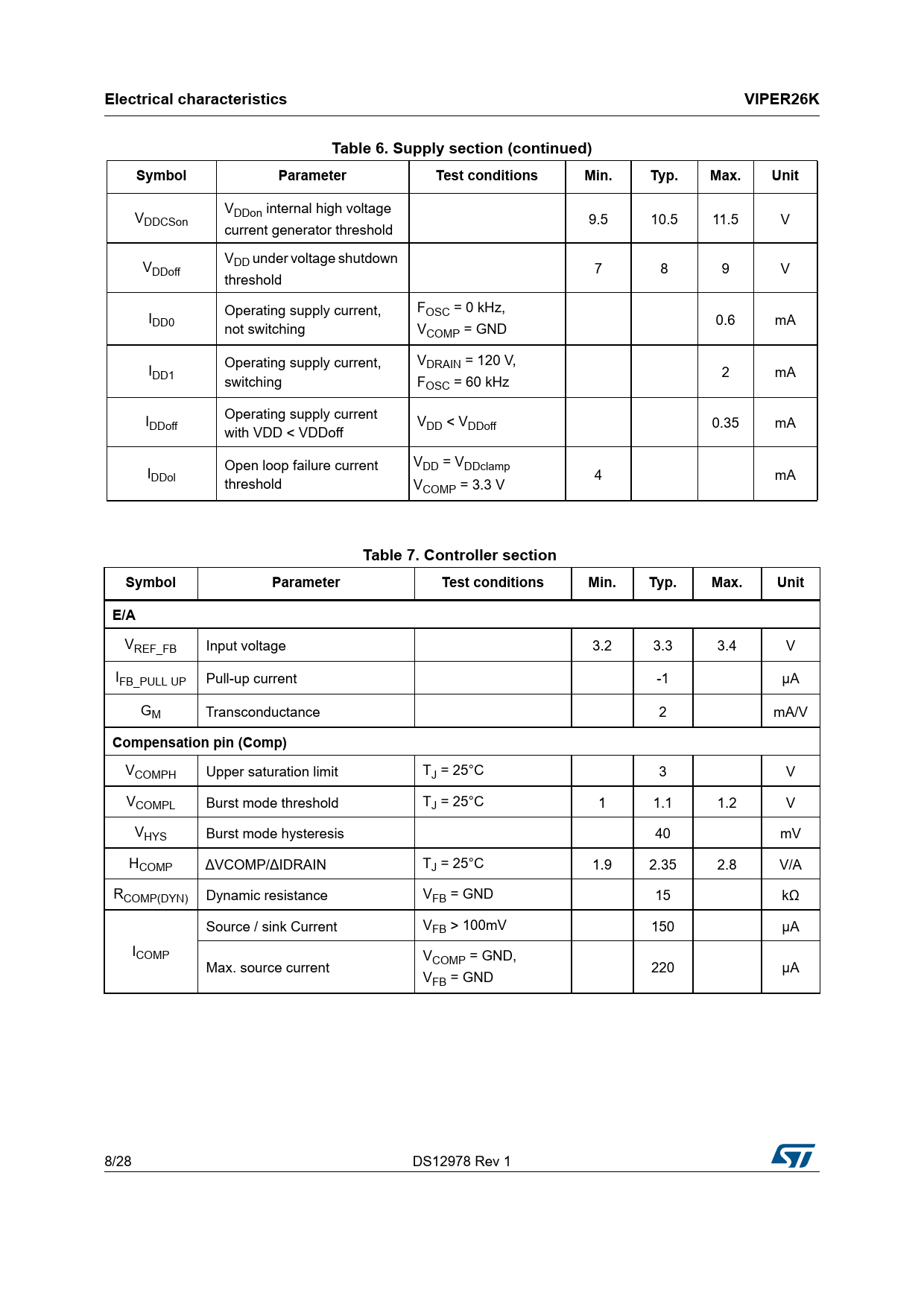 | Seiten / Seite | 28 / 8 — Electrical characteristics. VIPER26K. Table 6. Supply section … |