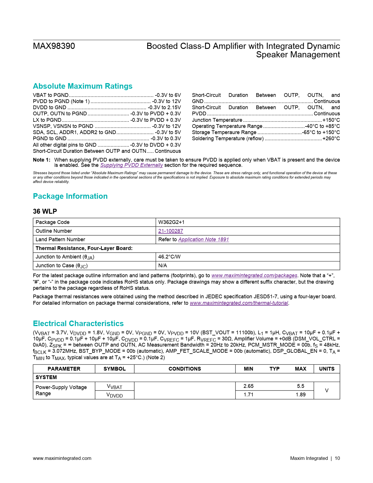 Absolute Maximum Ratings. Note 1:. Package Information. 36 WLP. Thermal Resistance, Four-Layer Board:. Electrical Characteristics