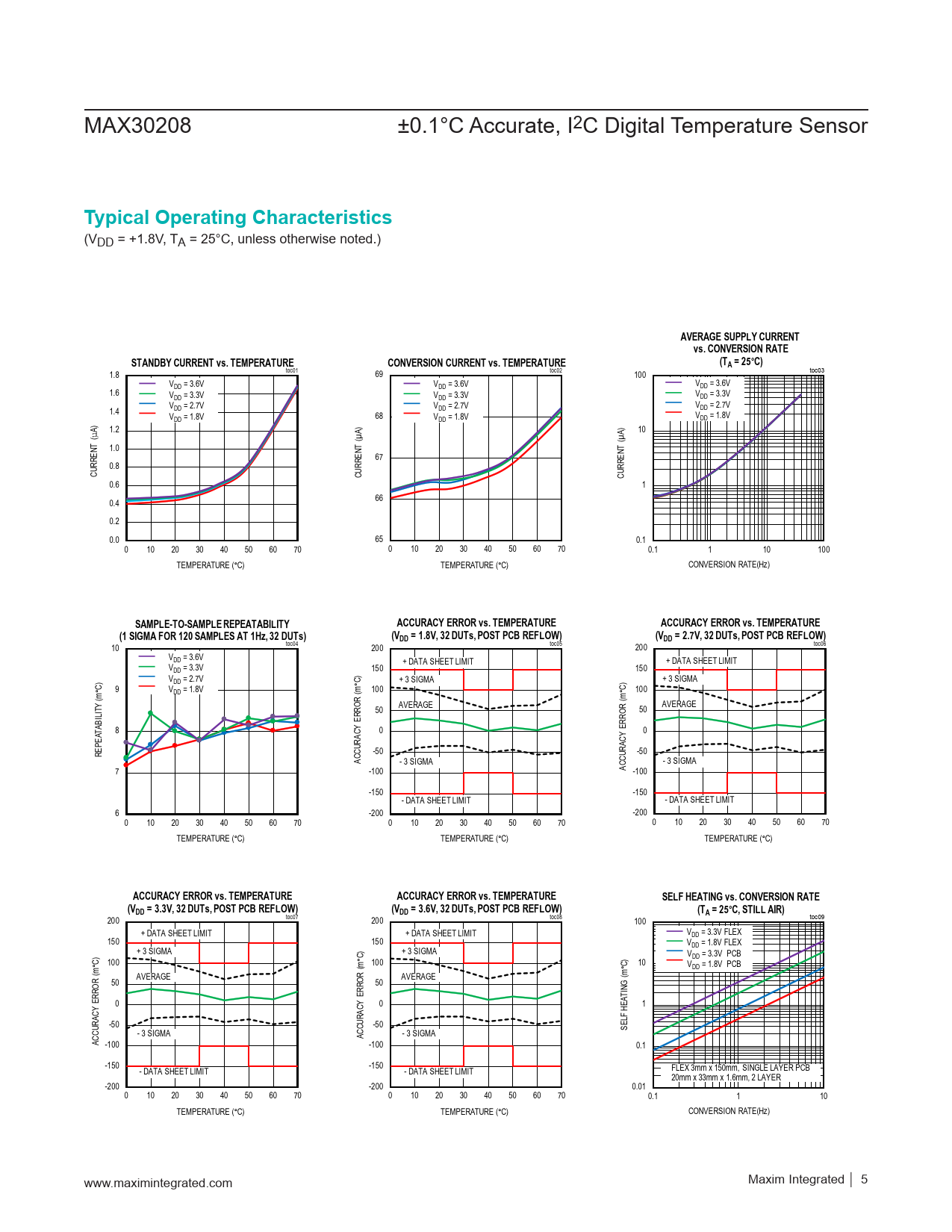 ACCURACY ERROR vs. TEMPERATURE ACCURACY ERROR vs. TEMPERATURE SELF HEATING vs. CONVERSION RATE (VDD = 3.3V, 32 DUTs, POST PCB REFLOW) (VDD = 3.6V, 32 DUTs, POST PCB REFLOW) (TA = 25