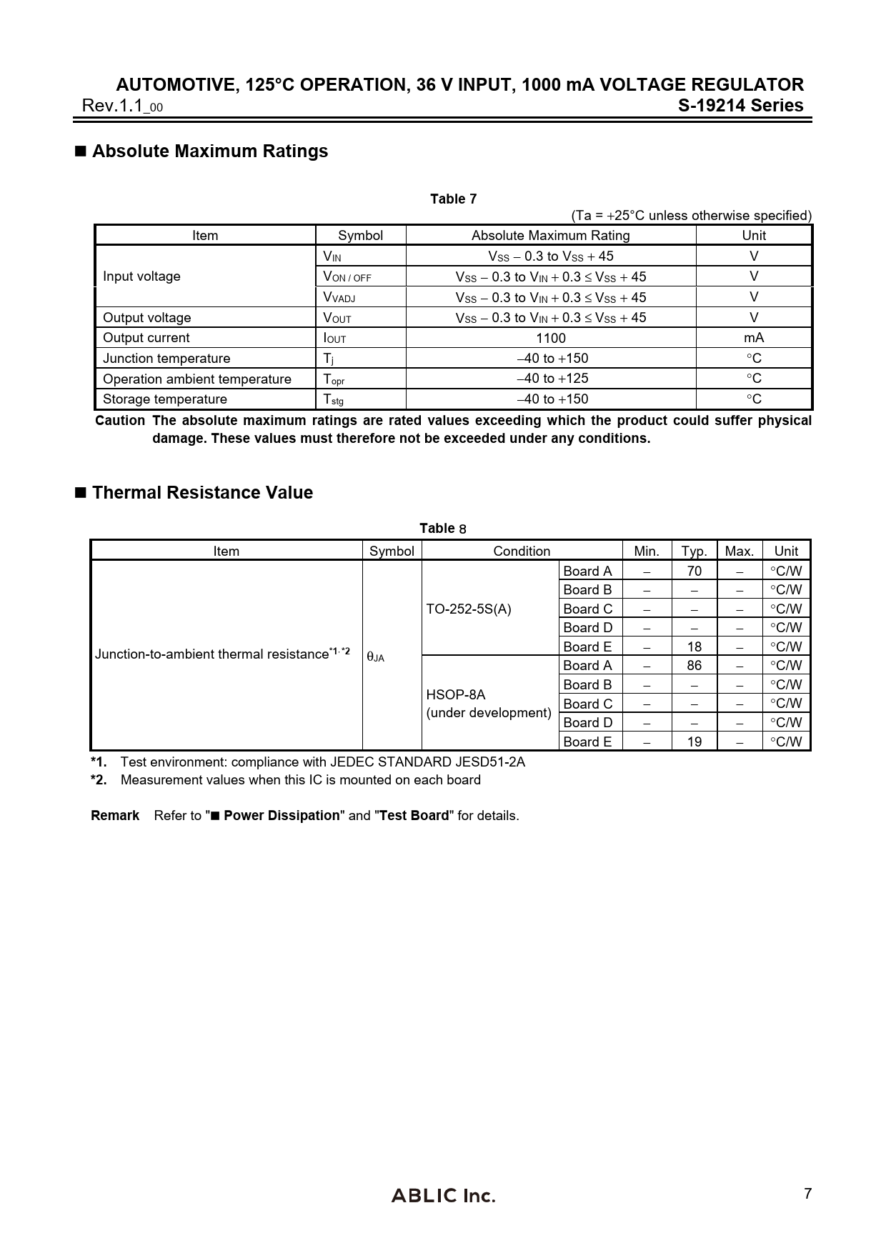 AUTOMOTIVE, 125°C OPERATION, 36 V INPUT, 1000 mA VOLTAGE REGULATOR. S-19214 Series. Absolute Maximum Ratings. Table 7