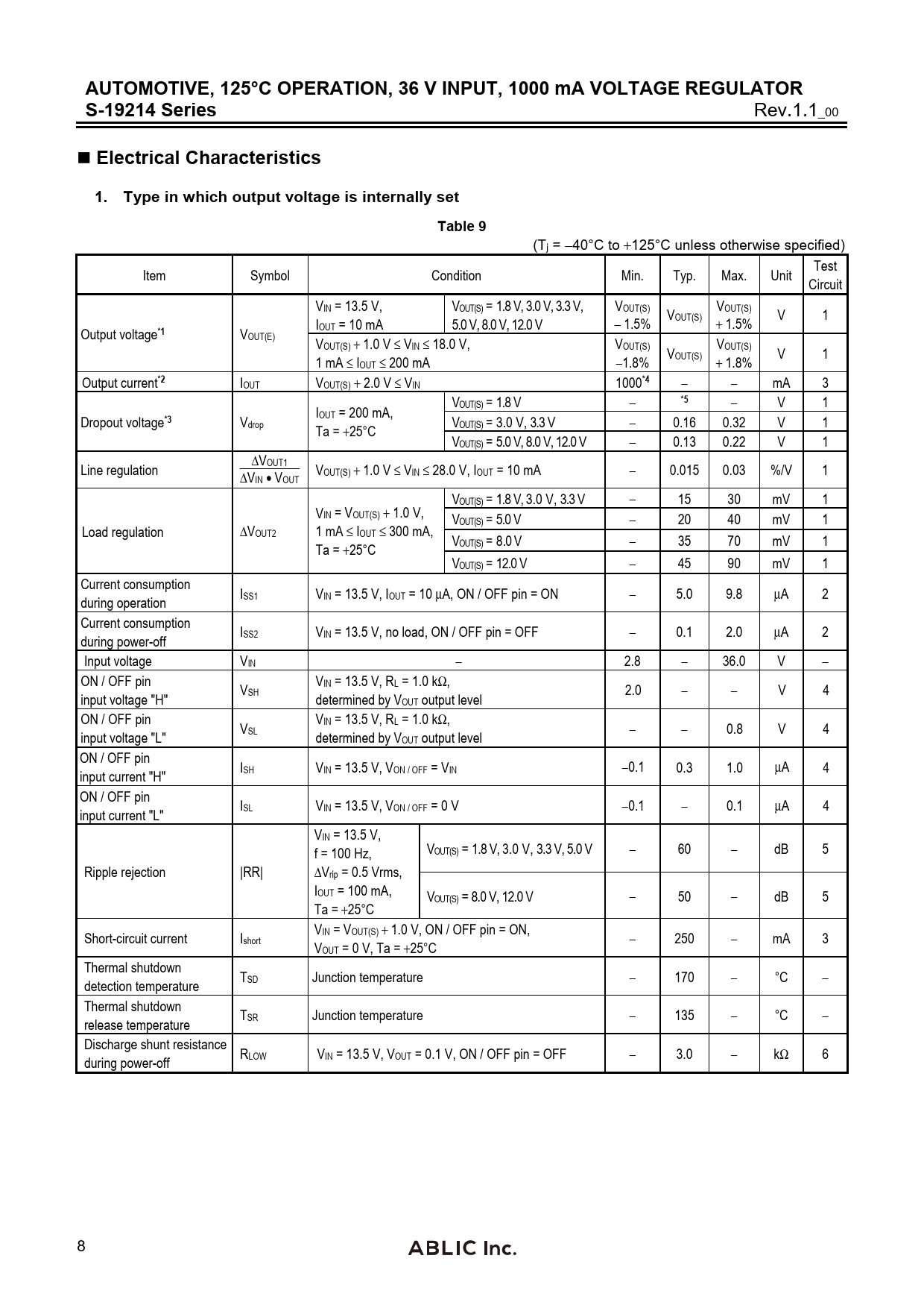 Electrical Characteristics 1. Type in which output voltage is internally set Table 9