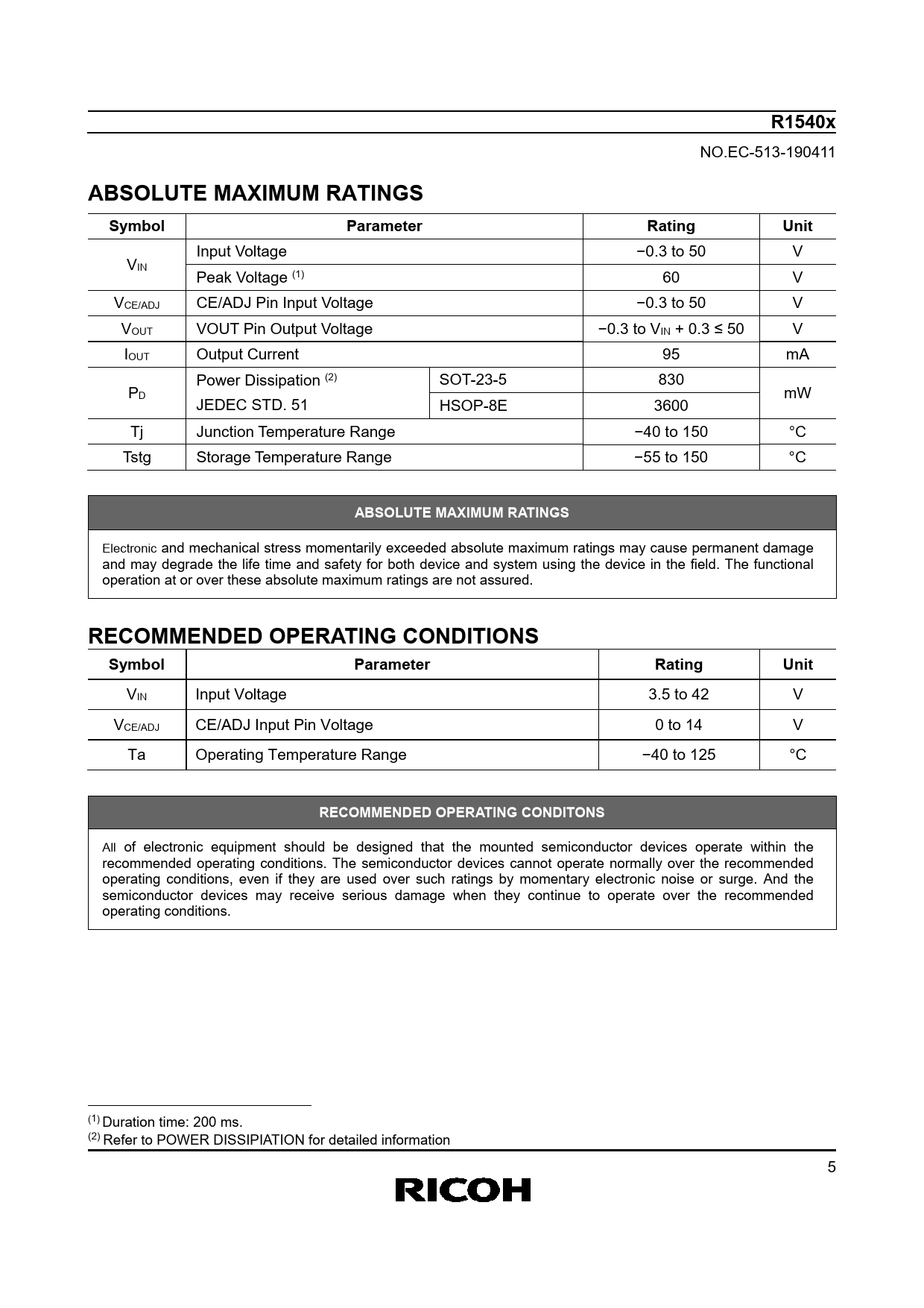 R1540x NO.EC-513-190411 ABSOLUTE MAXIMUM RATINGSSymbolParameterRatingUnit Input Voltage −0.3 to 50 V VIN Peak Voltage (1) 60 V VCE/ADJ CE/ADJ Pin Input Voltage −0.3 to 50 V VOUT VOUT Pin Output Voltage −0.3 to VIN + 0.3 ≤ 50 V IOUT Output Current 95 mA Power Dissipation (2) SOT-23-5 830 PD mW JEDEC STD. 51 HSOP-8E 3600 Tj Junction Temperature Range −40 to 150 °C Tstg Storage Temperature Range −55 to 150 °C ABSOLUTE MAXIMUM RATINGS Electronic and mechanical stress momentarily exceeded absolute maximum ratings may cause permanent damage and may degrade the life time and safety for both device and system using the device in the field. The functional operation at or over these absolute maximum ratings are not assured. RECOMMENDED OPERATING CONDITIONSSymbolParameterRatingUnit VIN Input Voltage 3.5 to 42 V VCE/ADJ CE/ADJ Input Pin Voltage 0 to 14 V Ta Operating Temperature Range −40 to 125 °C RECOMMENDED OPERATING CONDITONS All of electronic equipment should be designed that the mounted semiconductor devices operate within the recommended operating conditions. The semiconductor devices cannot operate normally over the recommended operating conditions, even if they are used over such ratings by momentary electronic noise or surge. And the semiconductor devices may receive serious damage when they continue to operate over the recommended operating conditions. (1) Duration time: 200 ms. (2) Refer to POWER DISSIPIATION for detailed information 5