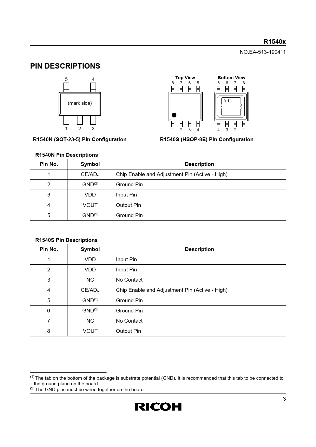R1540N (SOT-23-5) Pin Configuration R1540S (HSOP-8E) Pin Configuration1 R1540N Pin Descriptions Pin No. Symbol Description