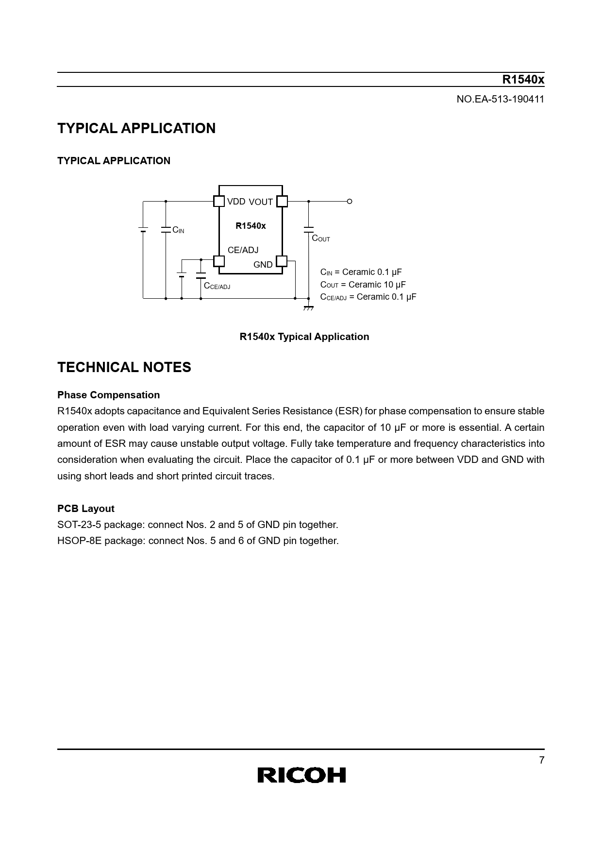 R1540x NO.EA-513-190411 TYPICAL APPLICATIONTYPICAL APPLICATION VDD VOUT CIN R1540x COUT CE/ADJ GND CIN = Ceramic 0.1 µF CCE/ADJ COUT = Ceramic 10 µF CCE/ADJ = Ceramic 0.1 µF R1540x Typical ApplicationTECHNICAL NOTESPhase Compensation R1540x adopts capacitance and Equivalent Series Resistance (ESR) for phase compensation to ensure stable operation even with load varying current. For this end, the capacitor of 10 μF or more is essential. A certain amount of ESR may cause unstable output voltage. Fully take temperature and frequency characteristics into consideration when evaluating the circuit. Place the capacitor of 0.1 μF or more between VDD and GND with using short leads and short printed circuit traces. PCB Layout SOT-23-5 package: connect Nos. 2 and 5 of GND pin together. HSOP-8E package: connect Nos. 5 and 6 of GND pin together. 7