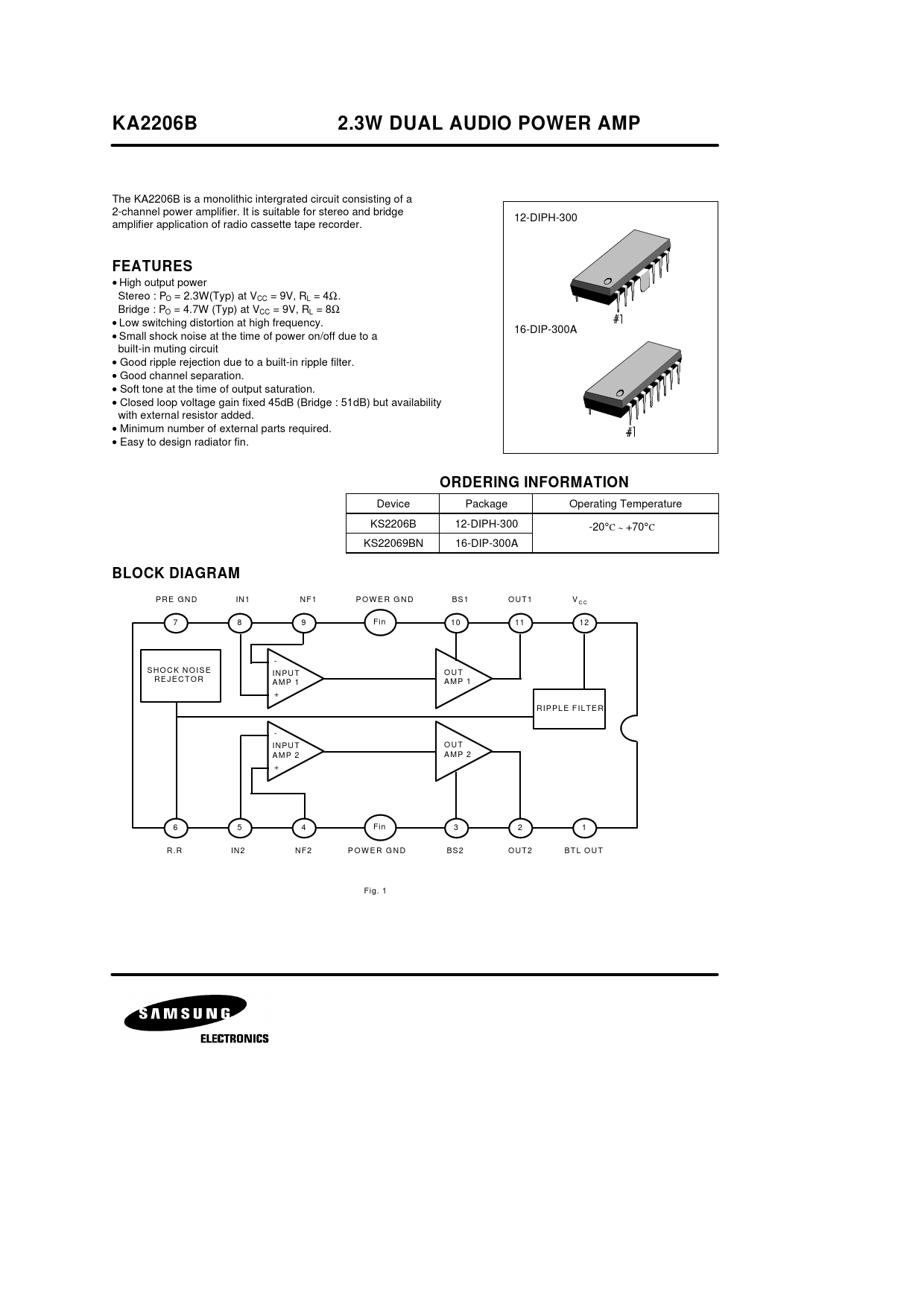 The KA2206B is a monolithic intergrated circuit consisting of a 2-channel power amplifier. It is suitable for stereo and bridge 12-DIPH-300 amplifier application of radio cassette tape recorder.