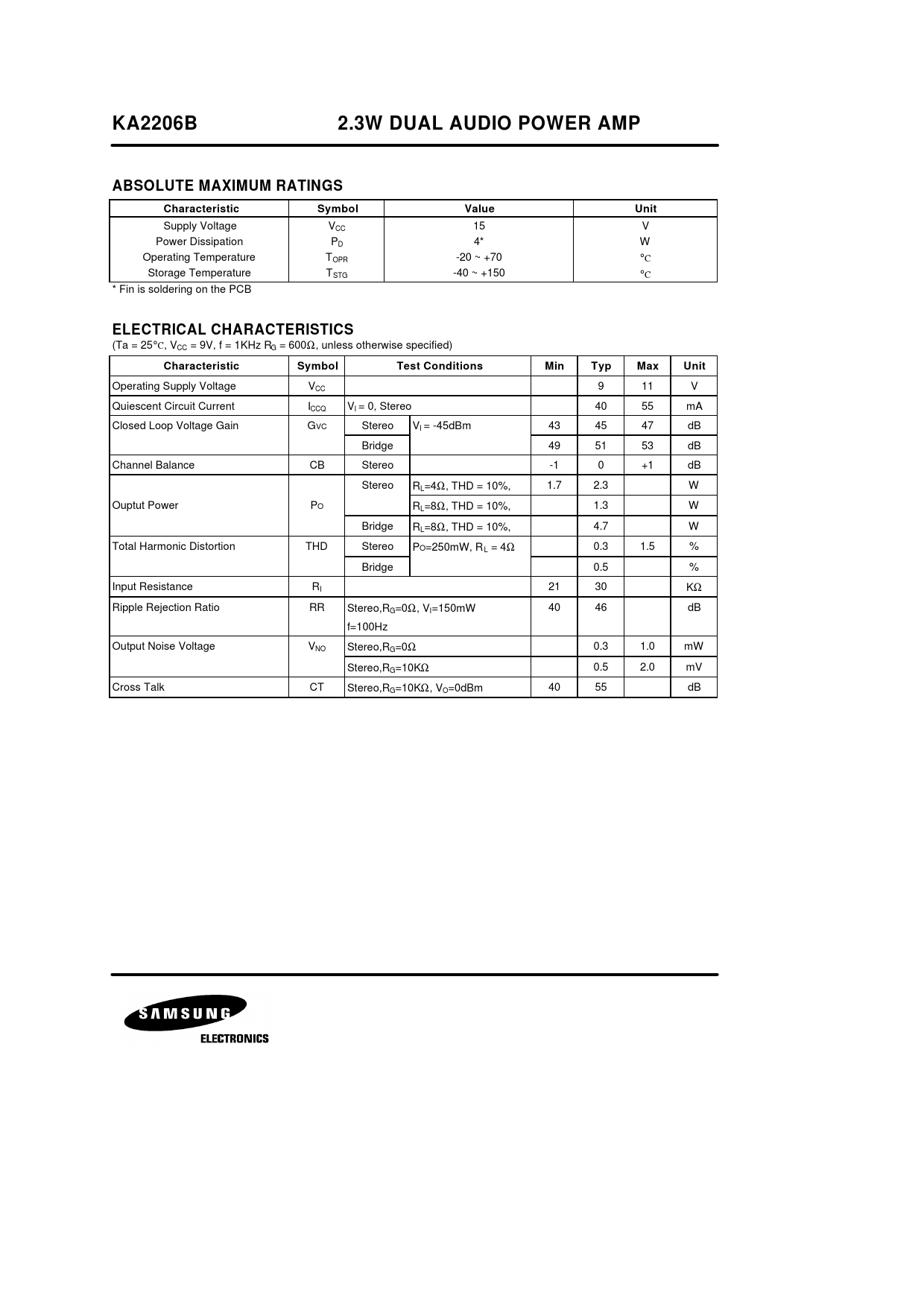 KA2206B 2.3W DUAL AUDIO POWER AMP ABSOLUTE MAXIMUM RATINGS Characteristic Symbol Value Unit ELECTRICAL CHARACTERISTICS