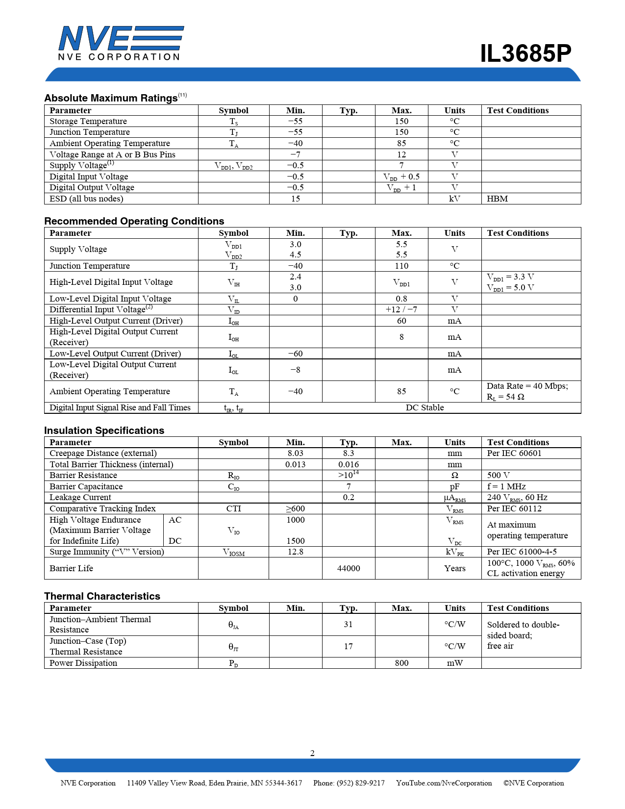 Junction–Ambient Thermal θ Resistance 31 °C/W Soldered to double- JA sided board; Junction–Case (Top) θ 17 free air °C/W Thermal Resistance JT Power Dissipation P 800 mW D 2 NVE Corporation 11409 Valley View Road, Eden Prairie, MN 55344-3617 Phone: (952) 829-9217 YouTube.com/NveCorporation ©NVE Corporation