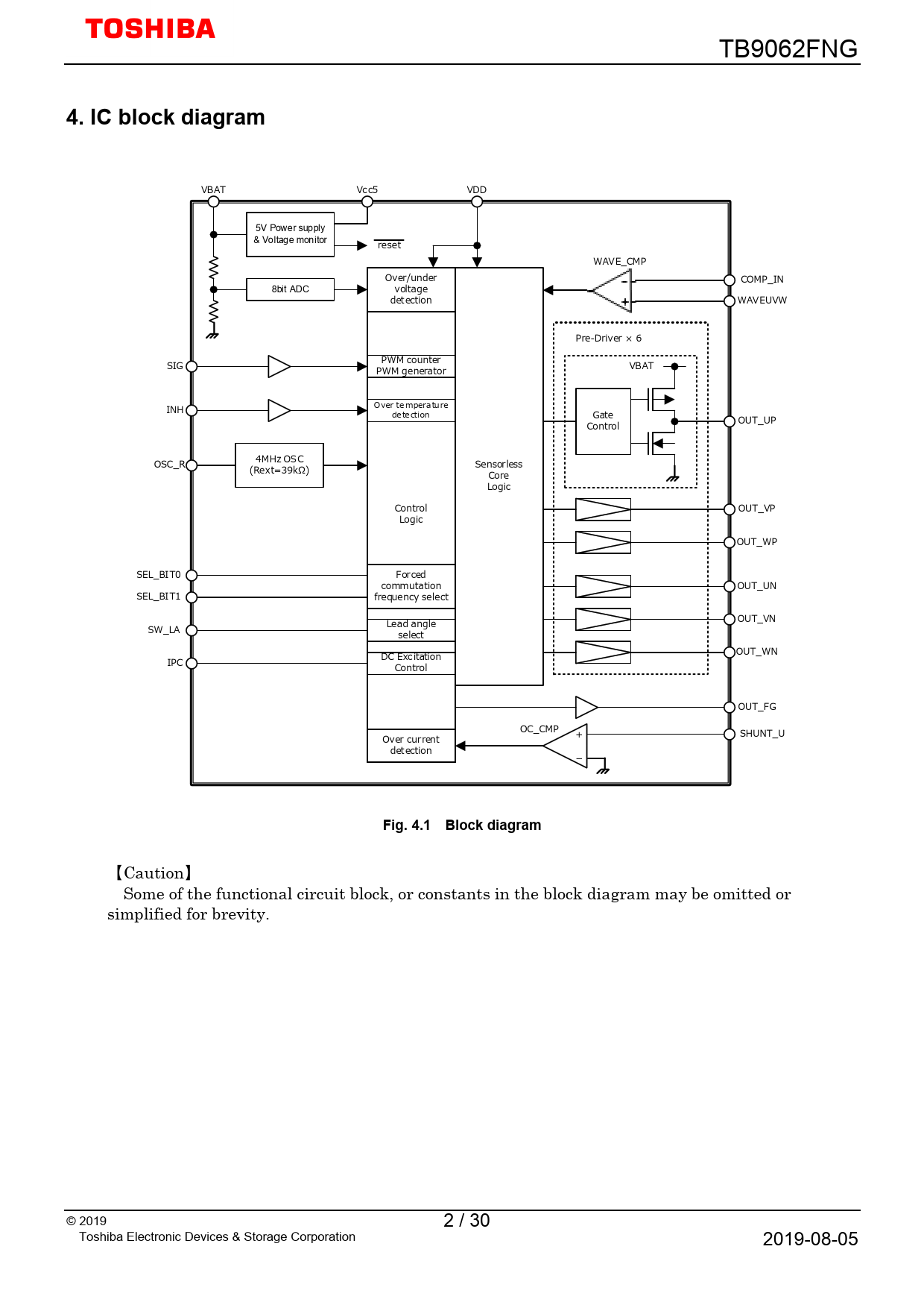 【Caution】 Some of the functional circuit block, or constants in the block diagram may be omitted or simplified for brevity. © 2019 2 / 30 Toshiba Electronic Devices & Storage Corporation 2019-08-05