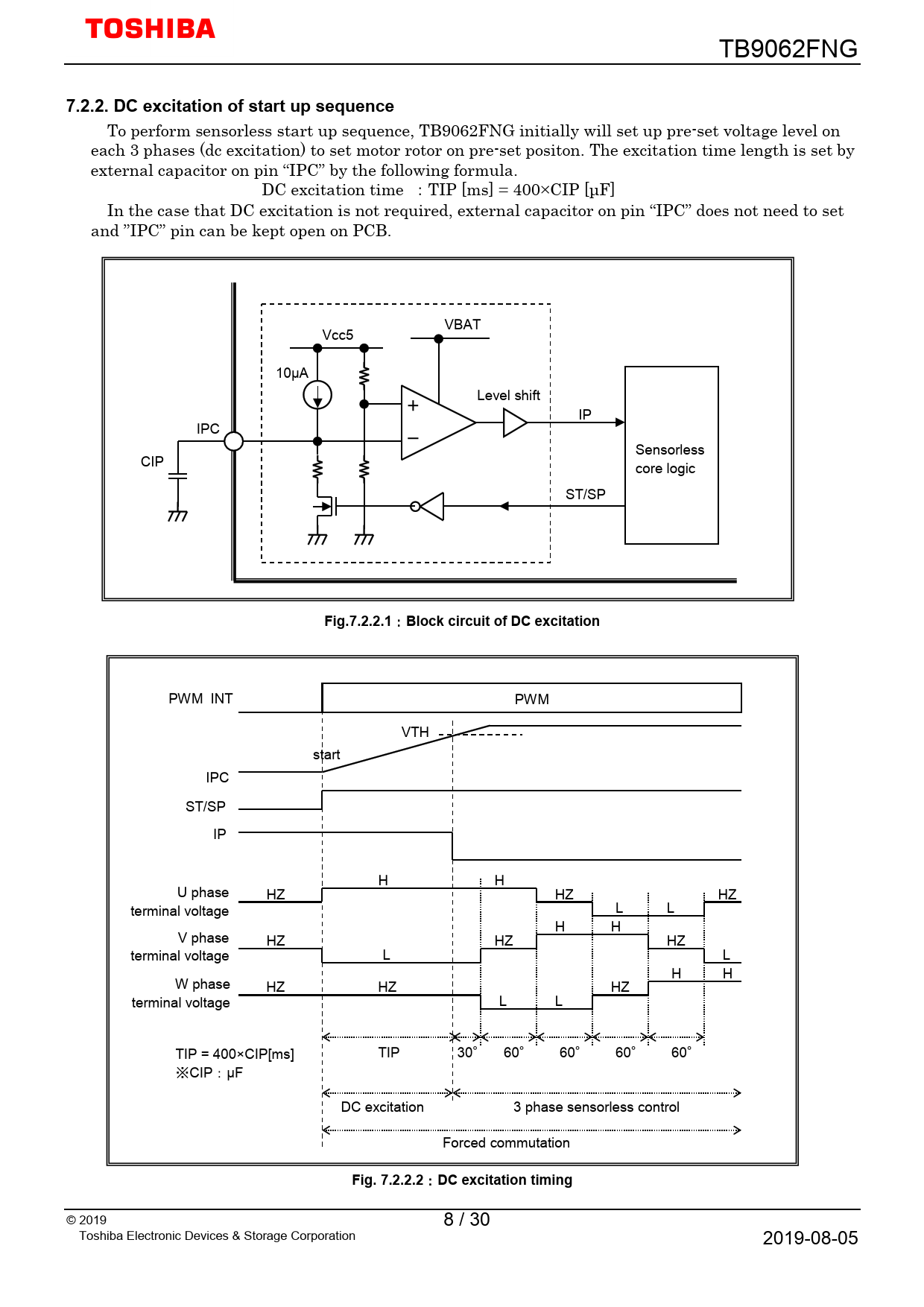 To perform sensorless start up sequence, TB9062FNG initially will set up pre-set voltage level on each 3 phases (dc excitation) to set motor rotor on pre-set positon. The excitation time length is set by external capacitor on pin “IPC” by the following formula. DC excitation time :TIP [ms] = 400×CIP [μF] In the case that DC excitation is not required, external capacitor on pin “IPC” does not need to set and ”IPC” pin can be kept open on PCB. VBAT Vcc5 10μA Level shift + IP IPC - Sensorless CIP core logic ST/SP