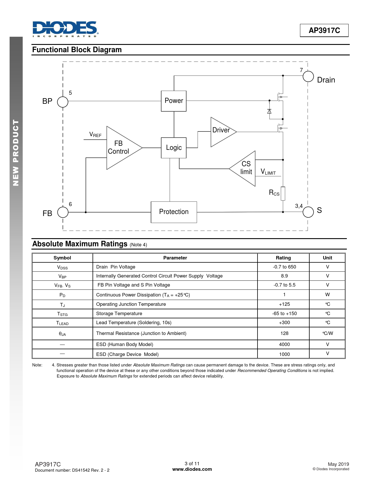 VDSS Drain Pin Voltage -0.7 to 650 V VBP Internally Generated Control Circuit Power Supply Voltage 8.9 V VFB,VS FB Pin Voltage and S Pin Voltage -0.7 to 5.5 V PD Continuous Power Dissipation (TA = +25°C) 1 W TJ Operating Junction Temperature +125 °C TSTG Storage Temperature -65 to +150 °C TLEAD Lead Temperature (Soldering, 10s) +300 °C θJA Thermal Resistance (Junction to Ambient) 128 °C/W — ESD (Human Body Model) 4000 V — ESD (Charge Device Model) 1000 V Note: 4. Stresses greater than those listed under Absolute Maximum Ratings can cause permanent damage to the device. These are stress ratings only, and functional operation of the device at these or any other conditions beyond those indicated under Recommended Operating Conditions is not implied. Exposure to Absolute Maximum Ratings for extended periods can affect device reliability. AP3917C 3 of 11 May 2019 Document number: DS41542 Rev. 2 - 2