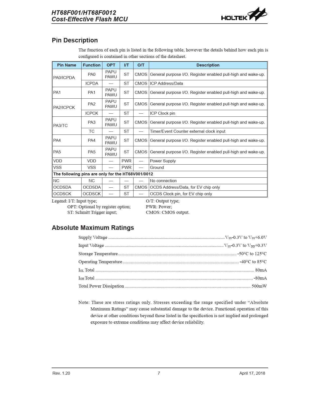 HT68F001/HT68F0012. Cost-Effective Flash MCU. Pin Description. Pin Name. Function. OPT. I/T. O/T. Description