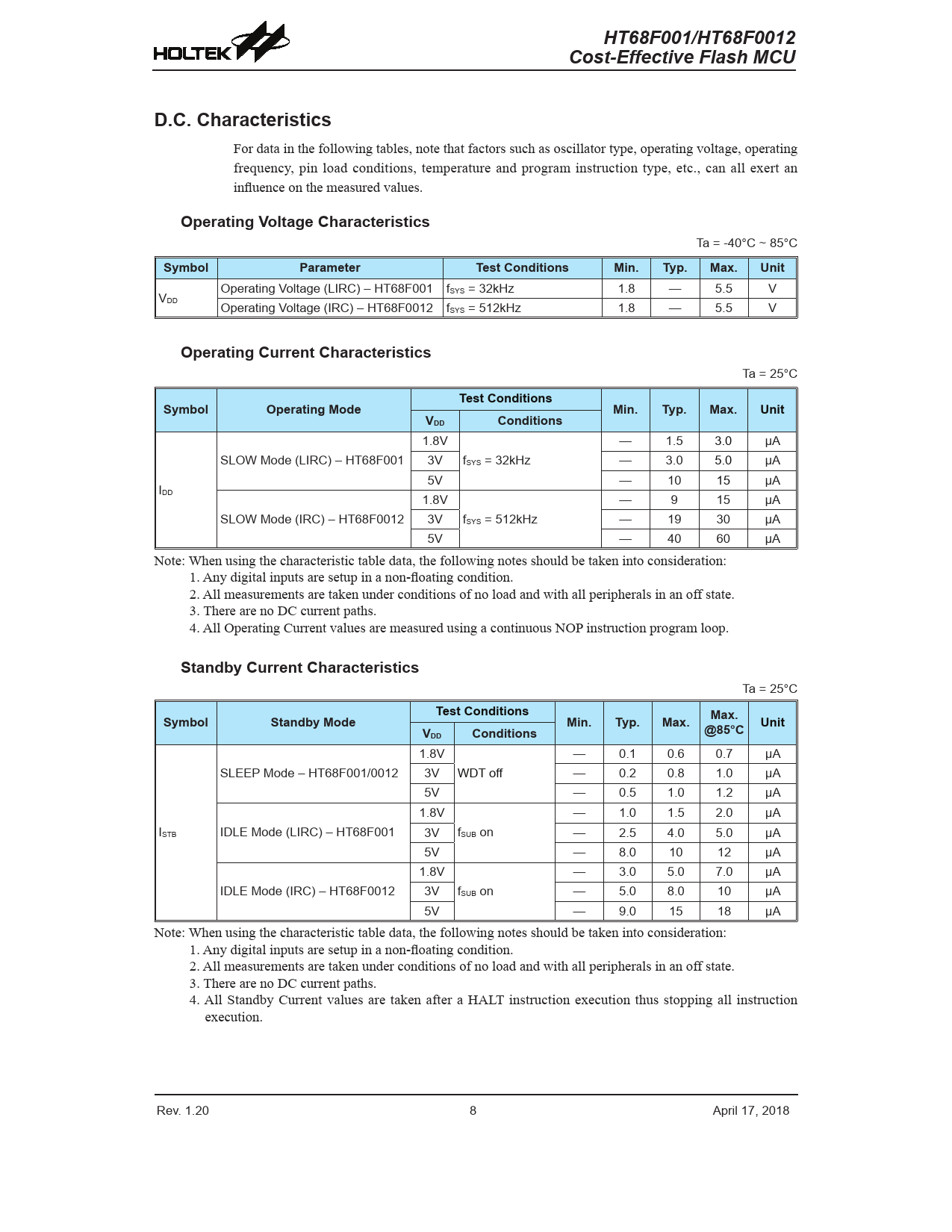 HT68F001/HT68F0012HT68F001/HT68F0012Cost-Effective Flash MCUCost-Effective Flash MCUD.C. Characteristics For data in the following tables, note that factors such as oscillator type, operating voltage, operating frequency, pin load conditions, temperature and program instruction type, etc., can all exert an influence on the measured values. Operating Voltage Characteristics Ta = -40°C ~ �5°C SymbolParameterTest ConditionsMin.Typ.Max.Unit O�e�ating Vo�tage (LIRC) – HT6�F001 f V SYS = 32kHz 1.� — 5.5 V DD O�e�ating Vo�tage (IRC) – HT6�F0012 fSYS = 512kHz 1.� — 5.5 V Operating Current Characteristics Ta = 25°C Test ConditionsSymbolOperating ModeMin.Typ.Max.UnitVDDConditions 1.�V — 1.5 3.0 μA SLOW Mode (LIRC) – HT6�F001 3V fSYS = 32kHz — 3.0 5.0 μA 5V — 10 15 μA IDD 1.�V — 9 15 μA SLOW Mode (IRC) – HT6�F0012 3V fSYS = 512kHz — 19 30 μA 5V — 40 60 μA Note: When using the characteristic table data, the following notes should be taken into consideration: 1. Any digital inputs are setup in a non-floating condition. 2. All measurements are taken under conditions of no load and with all peripherals in an off state. 3. There are no DC current paths. 4. All Operating Current values are measured using a continuous NOP instruction program loop. Standby Current Characteristics Ta = 25°C Test ConditionsSymbolStandby ModeMin.Typ.Max.Max.@85°C UnitVDDConditions 1.�V — 0.1 0.6 0.� μA SLEEP Mode – HT6�F001/0012 3V WDT off — 0.2 0.� 1.0 μA 5V — 0.5 1.0 1.2 μA 1.�V — 1.0 1.5 2.0 μA ISTB IDLE Mode (LIRC) – HT6�F001 3V fSUB on — 2.5 4.0 5.0 μA 5V — �.0 10 12 μA 1.�V — 3.0 5.0 �.0 μA IDLE Mode (IRC) – HT6�F0012 3V fSUB on — 5.0 �.0 10 μA 5V — 9.0 15 1� μA Note: When using the characteristic table data, the following notes should be taken into consideration: 1. Any digital inputs are setup in a non-floating condition. 2. All measurements are taken under conditions of no load and with all peripherals in an off state. 3. There are no DC current paths. 4. All Standby Current values are taken after a HALT instruction execution thus stopping all instruction execution. Rev. 1.20 � ���i� 1�� 201� Rev. 1.20 9 ���i� 1�� 201� Document Outline Features CPU Features Peripheral Features General Description Selection Table Block Diagram Pin Assignment Pin Description Absolute Maximum Ratings D.C. Characteristics Operating Voltage Characteristics Operating Current Characteristics Standby Current Characteristics A.C. Characteristics Low Speed Internal Oscillator Characteristics (LIRC) – HT68F001 Low Speed Internal Oscillator Characteristics (IRC) – HT68F0012 System Start Up Time Characteristics Input/Output Characteristics Power on Reset Characteristics System Architecture Clocking and Pipelining Program Counter Stack Arithmetic and Logic Unit – ALU Flash Program Memory Structure Special Vectors Look-up Table Table Program Example In Circuit Programming – ICP On-Chip Debug Support – OCDS Data Memory Structure General Purpose Data Memory Special Purpose Data Memory Special Function Register Description Indirect Addressing Registers – IAR0 Memory Pointers – MP0 Accumulator – ACC Program Counter Low Register – PCL Look-up Table Registers – TBLP Status Register – STATUS Oscillators Oscillator Overview System Clock Configurations Internal 32kHz Oscillator – LIRC Internal 512kHz Oscillator – IRC Operating Modes and System Clocks System Clocks System Operation Modes Standby Current Considerations Wake-up Watchdog Timer Watchdog Timer Clock Source Watchdog Timer Control Register Watchdog Timer Operation Reset and Initialisation Reset Functions Reset Initial Conditions Input/Output Ports Pull-high Resistors Port A Wake-up I/O Port Control Registers I/O Pin Structures Programming Considerations Timer/Event Counter Timer/Event Counter Registers – TMR, TMRC Timer Mode Event Counter Mode Pulse Width Capture Mode Interrupts Interrupt Registers Interrupt Operation Time Base Interrupt Interrupt Wake-up Function Programming Considerations Application Circuits Instruction Set Introduction Instruction Timing Moving and Transferring Data Arithmetic Operations Logical and Rotate Operation Branches and Control Transfer Bit Operations Table Read Operations Other Operations Instruction Set Summary Table Conventions Instruction Definition Package Information 8-pin SOP (150mil) Outline Dimensions