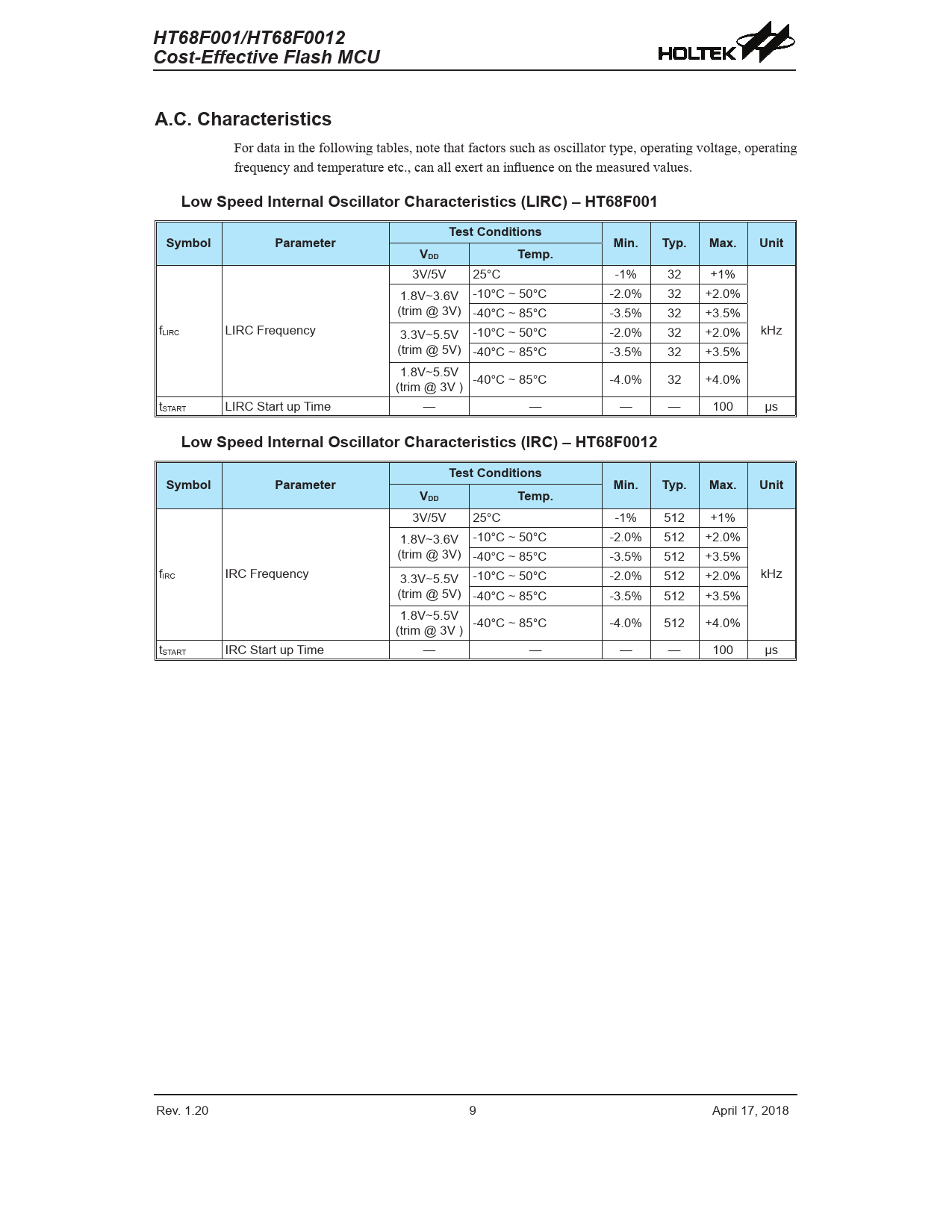 | Seiten / Seite | 56 / 9 — HT68F001/HT68F0012. Cost-Effective Flash MCU. A.C. Characteristics |