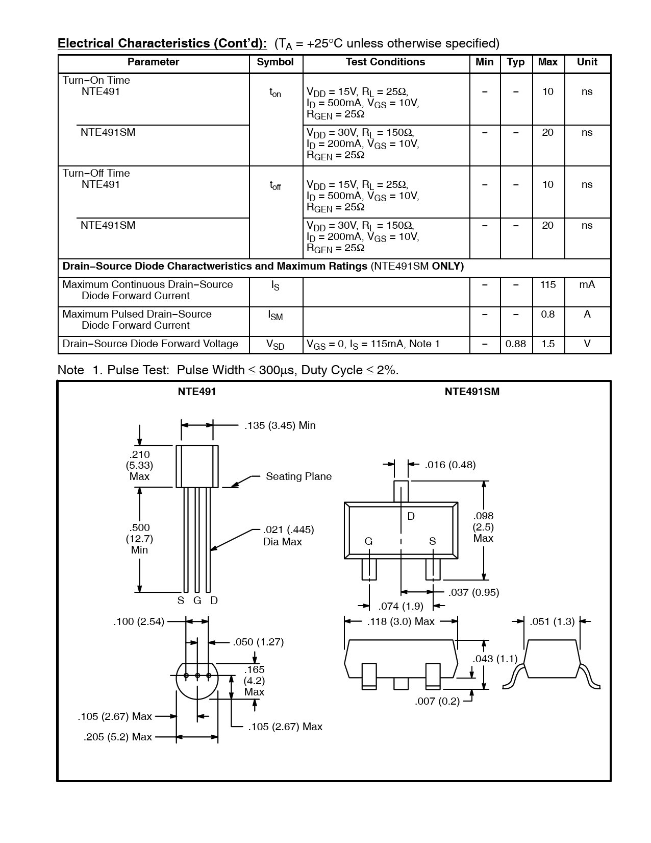 Turn−On Time NTE491 ton VDD = 15V, RL = 25Ω, − − 10 ns ID = 500mA, VGS = 10V, RGEN = 25Ω NTE491SM VDD = 30V, RL = 150Ω, − − 20 ns ID = 200mA, VGS = 10V, RGEN = 25Ω Turn−Off Time NTE491 toff VDD = 15V, RL = 25Ω, − − 10 ns ID = 500mA, VGS = 10V, RGEN = 25Ω NTE491SM VDD = 30V, RL = 150Ω, − − 20 ns ID = 200mA, VGS = 10V, RGEN = 25Ω
