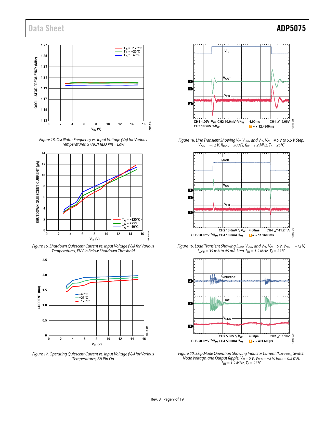 Data Sheet. ADP5075. 1.27. TA = +125°C. TA = +25°C. VIN. ) 1.25. TA = –40°C. Hz (M 1.23 NCY UE Q 1.21. VOUT. R F 1.19. VFB. LLAT 1.17 SCI. O 1.15