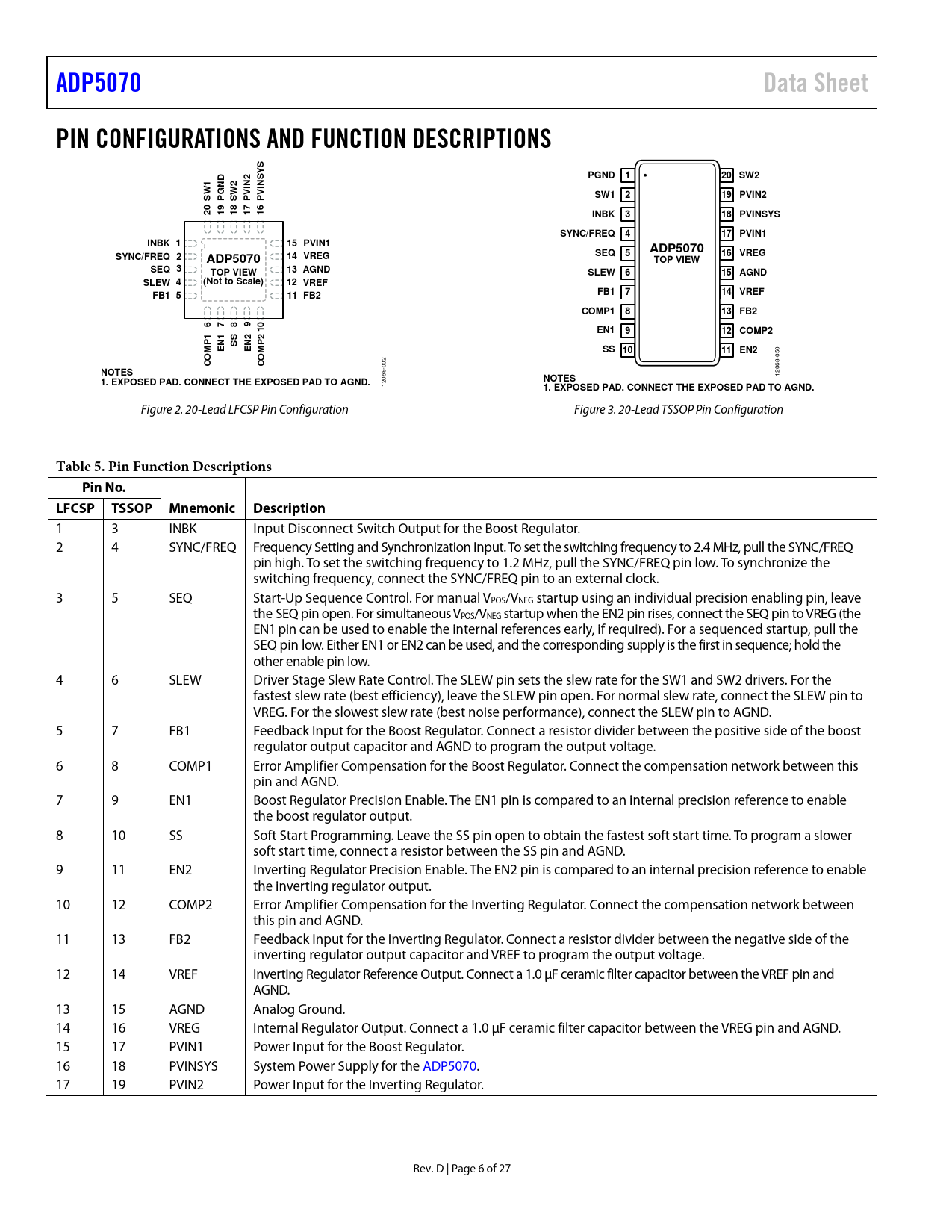 ADP5070 Data Sheet PIN CONFIGURATIONS AND FUNCTION DESCRIPTIONS SYS PGND 20 SW2 PVI SW1 19 PVIN2 INBK 18 PVINSYS SYNC/FREQ 17 PVIN1