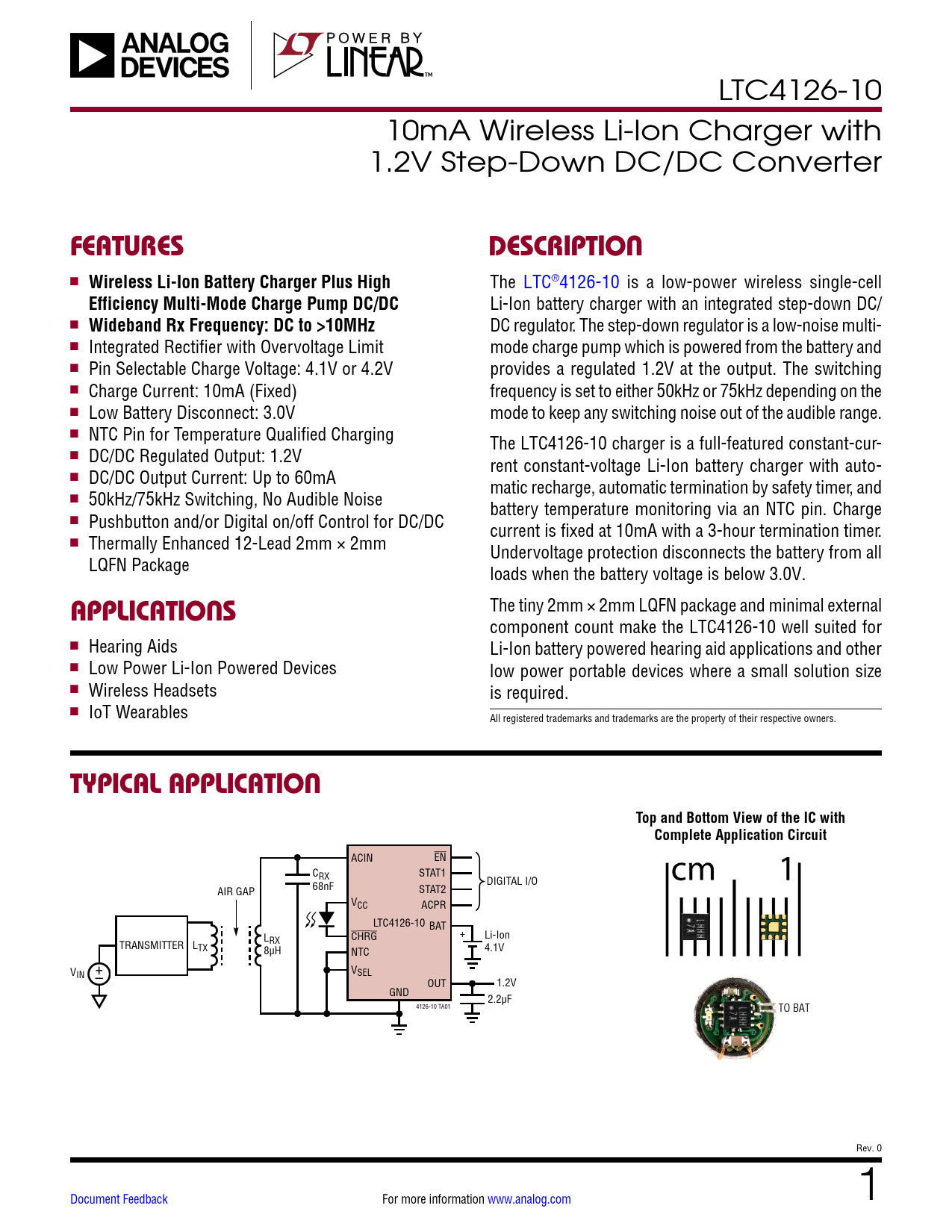 LTC4126-10 10mA Wireless Li-Ion Charger with 1.2V Step-Down DC/DC Converter FEATURESDESCRIPTION n Wireless Li-Ion Battery Charger Plus High The LTC®4126-10 is a low-power wireless single-cell Efficiency Multi-Mode Charge Pump DC/DC Li-Ion battery charger with an integrated step-down DC/ n Wideband Rx Frequency: DC to >10MHz DC regulator. The step-down regulator is a low-noise multi- n Integrated Rectifier with Overvoltage Limit mode charge pump which is powered from the battery and n Pin Selectable Charge Voltage: 4.1V or 4.2V provides a regulated 1.2V at the output. The switching n Charge Current: 10mA (Fixed) frequency is set to either 50kHz or 75kHz depending on the n Low Battery Disconnect: 3.0V mode to keep any switching noise out of the audible range. n NTC Pin for Temperature Qualified Charging The LTC4126-10 charger is a full-featured constant-cur- n DC/DC Regulated Output: 1.2V rent constant-voltage Li-Ion battery charger with auto- n DC/DC Output Current: Up to 60mA matic recharge, automatic termination by safety timer, and n 50kHz/75kHz Switching, No Audible Noise battery temperature monitoring via an NTC pin. Charge n Pushbutton and/or Digital on/off Control for DC/DC current is fixed at 10mA with a 3-hour termination timer. n Thermally Enhanced 12-Lead 2mm × 2mm Undervoltage protection disconnects the battery from all LQFN Package loads when the battery voltage is below 3.0V. The tiny 2mm × 2mm LQFN package and minimal external APPLICATIONS component count make the LTC4126-10 well suited for n Hearing Aids Li-Ion battery powered hearing aid applications and other n Low Power Li-Ion Powered Devices low power portable devices where a small solution size n Wireless Headsets is required. n IoT Wearables All registered trademarks and trademarks are the property of their respective owners. TYPICAL APPLICATIONTop and Bottom View of the IC withComplete Application Circuit ACIN EN CRX STAT1 68nF DIGITAL I/O AIR GAP STAT2 VCC ACPR LTC4126-10 BAT L CHRG + Li-Ion TRANSMITTER L RX TX 8µH 4.1V NTC V + IN VSEL – OUT 1.2V GND 2.2µF 4126-10 TA01 Rev. 0 Document Feedback For more information www.analog.com 1 Document Outline Features Applications Typical Application Description Absolute Maximum Ratings Order Information Electrical Characteristics Pin Configuration Typical Performance Characteristics Pin Functions Block Diagram Operation Applications Information Typical Applications Package Description Typical Application Related Parts