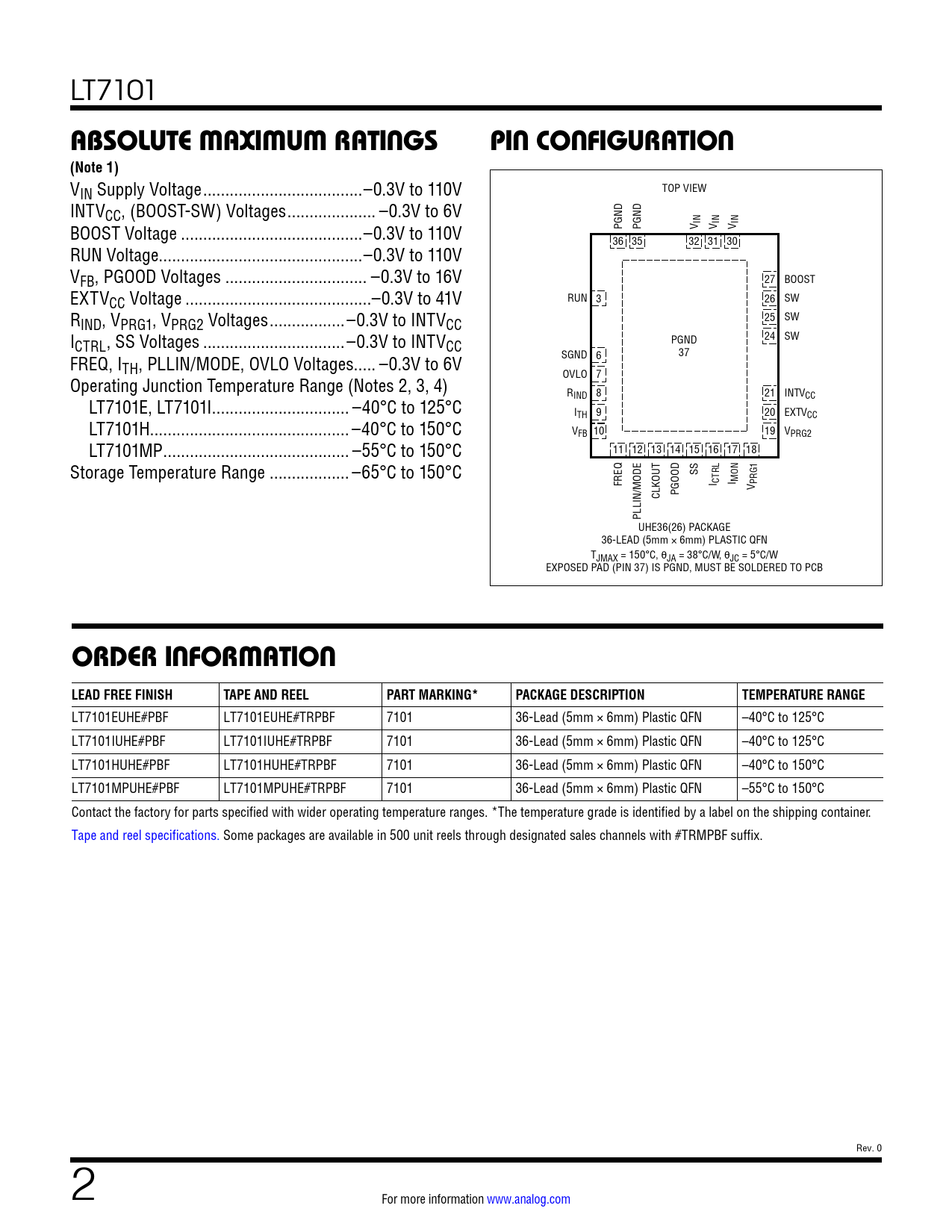 LT7101EUHE#PBF LT7101EUHE#TRPBF 7101 36-Lead (5mm × 6mm) Plastic QFN –40°C to 125°C LT7101IUHE#PBF LT7101IUHE#TRPBF 7101 36-Lead (5mm × 6mm) Plastic QFN –40°C to 125°C LT7101HUHE#PBF LT7101HUHE#TRPBF 7101 36-Lead (5mm × 6mm) Plastic QFN –40°C to 150°C LT7101MPUHE#PBF LT7101MPUHE#TRPBF 7101 36-Lead (5mm × 6mm) Plastic QFN –55°C to 150°C Contact the factory for parts specified with wider operating temperature ranges. *The temperature grade is identified by a label on the shipping container. Tape and reel specifications. Some packages are available in 500 unit reels through designated sales channels with #TRMPBF suffix. Rev. 0 2 For more information www.analog.com Document Outline Features Applications Typical Application Description Absolute Maximum Ratings Order Information Pin Configuration Electrical Characteristics Typical Performance Characteristics Pin Functions Functional Diagram Operation Applications Information Typical Applications Package Description Typical Application Related Parts