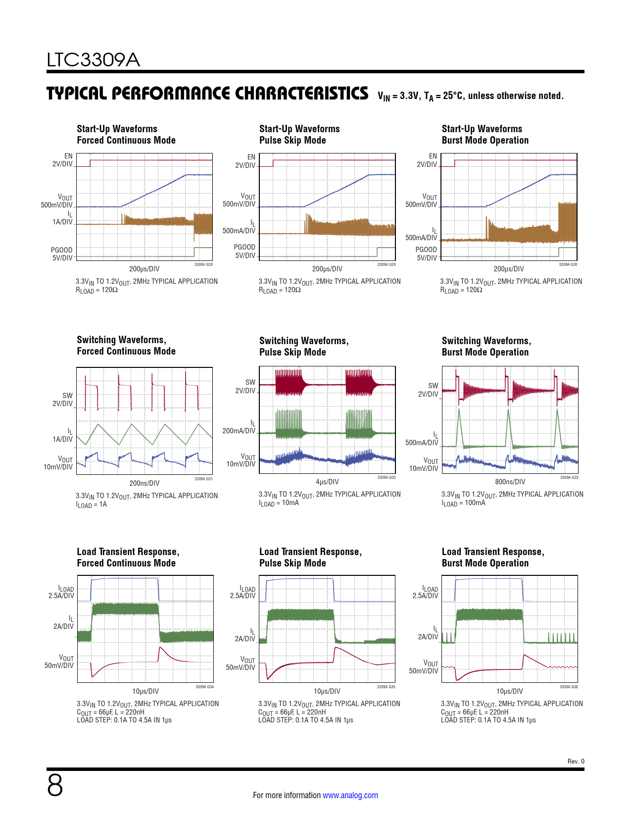 ILOAD ILOAD ILOAD 2.5A/DIV 2.5A/DIV 2.5A/DIV IL 2A/DIV I I L L 2A/DIV 2A/DIV VOUT V 50mV/DIV OUT V 50mV/DIV OUT 50mV/DIV 10µs/DIV 3309A G34 10µs/DIV 3309A G35 10µs/DIV 3309A G36 3.3VIN TO 1.2VOUT, 2MHz TYPICAL APPLICATION 3.3VIN TO 1.2VOUT, 2MHz TYPICAL APPLICATION 3.3VIN TO 1.2VOUT, 2MHz TYPICAL APPLICATION COUT = 66µF, L = 220nH COUT = 66µF, L = 220nH COUT = 66µF, L = 220nH LOAD STEP: 0.1A TO 4.5A IN 1µs LOAD STEP: 0.1A TO 4.5A IN 1µs LOAD STEP: 0.1A TO 4.5A IN 1µs Rev. 0 8 For more information www.analog.com Document Outline Features Applications Typical Application Description Absolute Maximum Ratings Order Information Pin Configuration Electrical Characteristics Typical Performance Characteristics Pin Functions Block Diagram Operation Applications Information Typical Applications Package Description Typical Application Related Parts