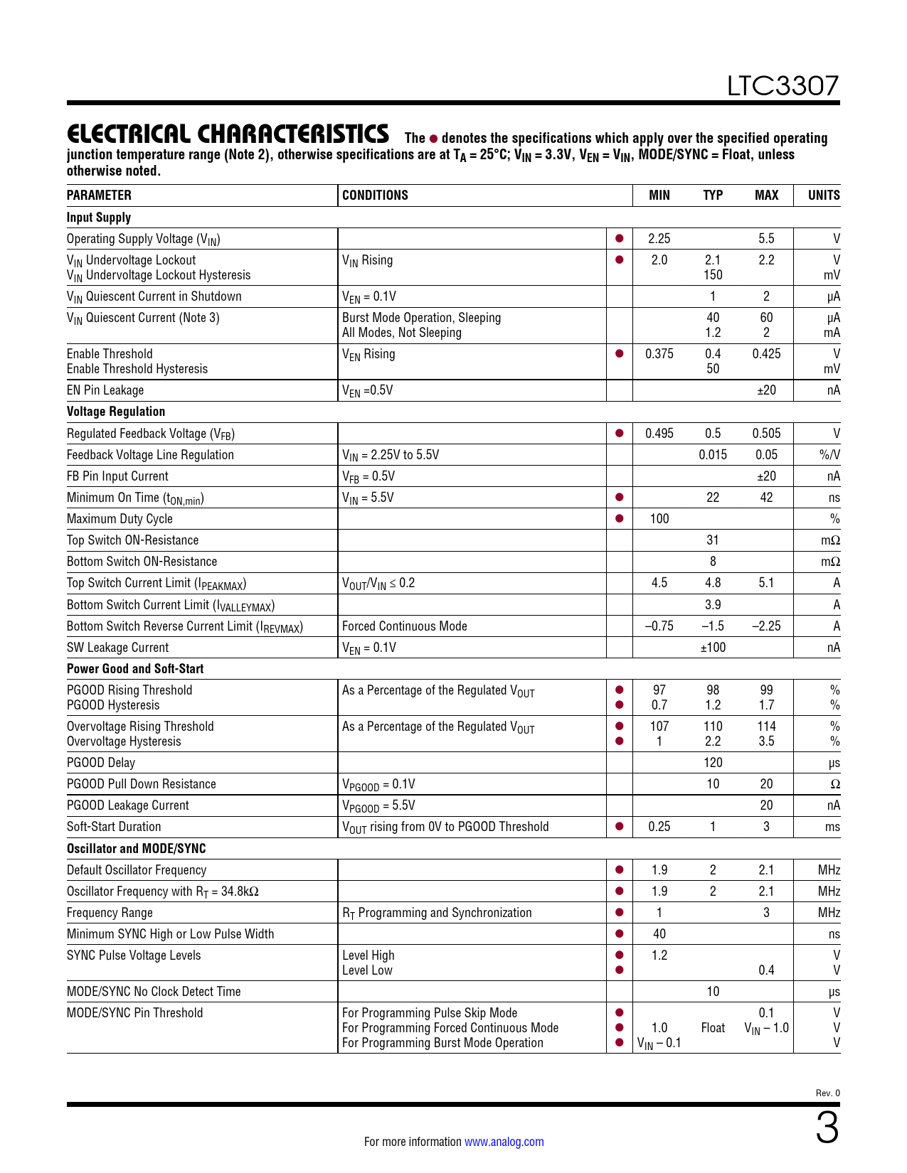 LTC3307 ELECTRICAL CHARACTERISTICSThe l denotes the specifications which apply over the specified operatingjunction temperature range (Note 2), otherwise specifications are at TA = 25°C; VIN = 3.3V, VEN = VIN, MODE/SYNC = Float, unlessotherwise noted. PARAMETERCONDITIONSMINTYPMAXUNITSInput Supply Operating Supply Voltage (VIN) l 2.25 5.5 V VIN Undervoltage Lockout VIN Rising l 2.0 2.1 2.2 V VIN Undervoltage Lockout Hysteresis 150 mV VIN Quiescent Current in Shutdown VEN = 0.1V 1 2 µA VIN Quiescent Current (Note 3) Burst Mode Operation, Sleeping 40 60 µA All Modes, Not Sleeping 1.2 2 mA Enable Threshold VEN Rising l 0.375 0.4 0.425 V Enable Threshold Hysteresis 50 mV EN Pin Leakage VEN =0.5V ±20 nA Voltage Regulation Regulated Feedback Voltage (VFB) l 0.495 0.5 0.505 V Feedback Voltage Line Regulation VIN = 2.25V to 5.5V 0.015 0.05 %/V FB Pin Input Current VFB = 0.5V ±20 nA Minimum On Time (tON,min) VIN = 5.5V l 22 42 ns Maximum Duty Cycle l 100 % Top Switch ON-Resistance 31 mΩ Bottom Switch ON-Resistance 8 mΩ Top Switch Current Limit (IPEAKMAX) VOUT/VIN ≤ 0.2 4.5 4.8 5.1 A Bottom Switch Current Limit (IVALLEYMAX) 3.9 A Bottom Switch Reverse Current Limit (IREVMAX) Forced Continuous Mode –0.75 –1.5 –2.25 A SW Leakage Current VEN = 0.1V ±100 nA Power Good and Soft-Start PGOOD Rising Threshold As a Percentage of the Regulated VOUT l 97 98 99 % PGOOD Hysteresis l 0.7 1.2 1.7 % Overvoltage Rising Threshold As a Percentage of the Regulated VOUT l 107 110 114 % Overvoltage Hysteresis l 1 2.2 3.5 % PGOOD Delay 120 µs PGOOD Pull Down Resistance VPGOOD = 0.1V 10 20 Ω PGOOD Leakage Current VPGOOD = 5.5V 20 nA Soft-Start Duration VOUT rising from 0V to PGOOD Threshold l 0.25 1 3 ms Oscillator and MODE/SYNC Default Oscillator Frequency l 1.9 2 2.1 MHz Oscillator Frequency with RT = 34.8kΩ l 1.9 2 2.1 MHz Frequency Range RT Programming and Synchronization l 1 3 MHz Minimum SYNC High or Low Pulse Width l 40 ns SYNC Pulse Voltage Levels Level High l 1.2 V Level Low l 0.4 V MODE/SYNC No Clock Detect Time 10 µs MODE/SYNC Pin Threshold For Programming Pulse Skip Mode l 0.1 V For Programming Forced Continuous Mode l 1.0 Float VIN – 1.0 V For Programming Burst Mode Operation l VIN – 0.1 V Rev. 0 For more information www.analog.com 3 Document Outline Features Applications Typical Application Description Absolute Maximum Ratings Order Information Pin Configuration Electrical Characteristics Typical Performance Characteristics Pin Functions Block Diagram Operation Applications Information Typical Applications Package Description Typical Application Related Parts