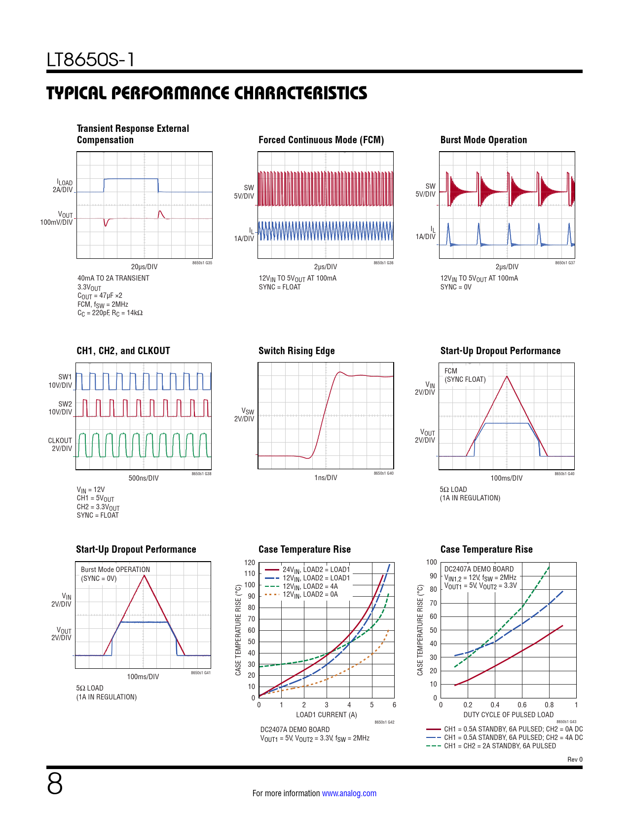 120 100 Burst Mode OPERATION DC2407A DEMO BOARD 110 24VIN, LOAD2 = LOAD1 (SYNC = 0V) 12V 90 IN, LOAD2 = LOAD1 VIN1,2 = 12V, fSW = 2MHz 100 12VIN, LOAD2 = 4A 80 VOUT1 = 5V, VOUT2 = 3.3V VIN 90 12VIN, LOAD2 = 0A 2V/DIV 70 80 70 60 V TURE RISE (°C) TURE RISE (°C) OUT 60 50 2V/DIV 50 40 40 30 30 20 100ms/DIV 8650s1 G41 CASE TEMPERA 20 CASE TEMPERA 5Ω LOAD 10 10 (1A IN REGULATION) 0 0 0 1 2 3 4 5 6 0 0.2 0.4 0.6 0.8 1 LOAD1 CURRENT (A) DUTY CYCLE OF PULSED LOAD 8650s1 G42 8650s1 G43 DC2407A DEMO BOARD CH1 = 0.5A STANDBY, 6A PULSED; CH2 = 0A DC VOUT1 = 5V, VOUT2 = 3.3V, fSW = 2MHz CH1 = 0.5A STANDBY, 6A PULSED; CH2 = 4A DC CH1 = CH2 = 2A STANDBY, 6A PULSED Rev 0 8 For more information www.analog.com Document Outline Features Applications Typical Application Description Absolute Maximum Ratings Order Information Electrical Characteristics Pin Configuration Electrical Characteristics Typical Performance Characteristics Pin Functions Block Diagram Operation Applications Information Typical Applications Package Description Typical Application Related Parts