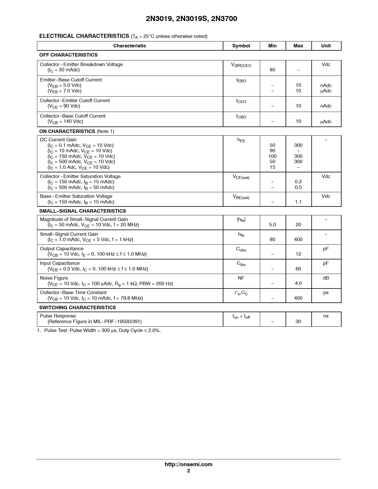 2N3019, 2N3019S, 2N3700. ELECTRICAL CHARACTERISTICS. Characteristic. Symbol. Min. Max. Unit. OFF CHARACTERISTICS. ON CHARACTERISTICS
