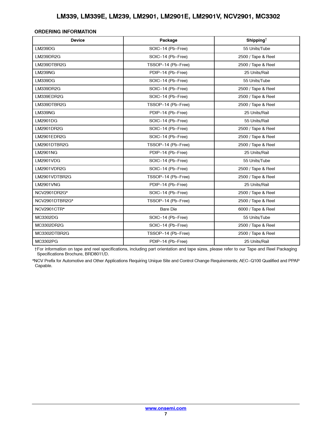 LM339, LM339E, LM239, LM2901, LM2901E, LM2901V, NCV2901, MC3302. ORDERING INFORMATION. Device. Package. Shipping. www.onsemi.com