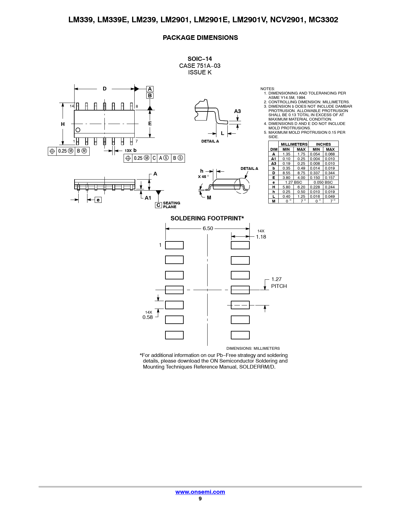LM339, LM339E, LM239, LM2901, LM2901E, LM2901V, NCV2901, MC3302PACKAGE DIMENSIONSSOIC−14 CASE 751A−03 ISSUE K DA NOTES: 1. DIMENSIONING AND TOLERANCING PER B ASME Y14.5M, 1994. 2. CONTROLLING DIMENSION: MILLIMETERS. 14 8 3. DIMENSION b DOES NOT INCLUDE DAMBAR PROTRUSION. ALLOWABLE PROTRUSION A3 SHALL BE 0.13 TOTAL IN EXCESS OF AT MAXIMUM MATERIAL CONDITION. E 4. DIMENSIONS D AND E DO NOT INCLUDE H MOLD PROTRUSIONS. 5. MAXIMUM MOLD PROTRUSION 0.15 PER L SIDE. 1 7 DETAIL AMILLIMETERSINCHES 0.25 DIMMINMAXMINMAX M B M 13X bA 1.35 1.75 0.054 0.068 0.25 M C A S B S A1 0.10 0.25 0.004 0.010 A3 0.19 0.25 0.008 0.010 hDETAIL Ab 0.35 0.49 0.014 0.019 AD 8.55 8.75 0.337 0.344 X 45 _ E 3.80 4.00 0.150 0.157 e 1.27 BSC 0.050 BSC H 5.80 6.20 0.228 0.244 h 0.25 0.50 0.010 0.019 A1ML 0.40 1.25 0.016 0.049 eM 0 _ 7 _ 0 _ 7 _ C SEATINGPLANESOLDERING FOOTPRINT* 6.50 14X 1.18 1 1.27 PITCH 14X 0.58 DIMENSIONS: MILLIMETERS *For additional information on our Pb−Free strategy and soldering details, please download the ON Semiconductor Soldering and Mounting Techniques Reference Manual, SOLDERRM/D. www.onsemi.com9