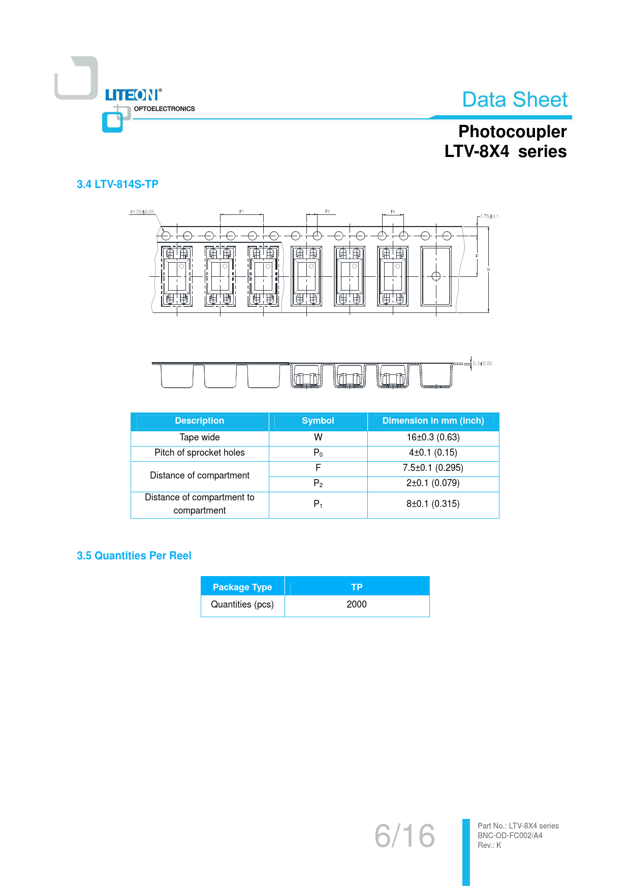 Photocoupler LTV-8X4 series 3.4 LTV-814S-TP Description Symbol Dimension in mm (inch) 3.5 Quantities Per Reel Package Type
