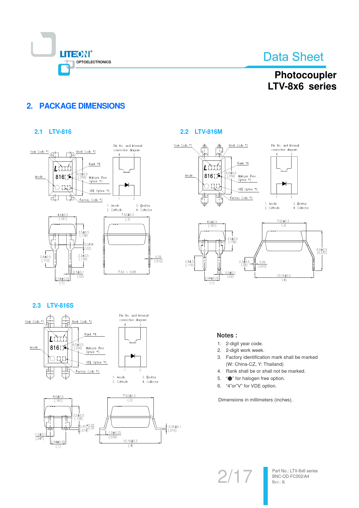 PhotocouplerLTV-8x6 series2. PACKAGE DIMENSIONS2.1 LTV-816 2.2 LTV-816M2.3 LTV-816SNotes : 1. 2-digit year code. 2. 2-digit work week. 3. Factory identification mark shall be marked (W: China-CZ, Y: Thailand) 4. Rank shall be or shall not be marked. 5. “●” for halogen free option. 6. “4”or”V” for VDE option. Dimensions in millimeters (inches). 2/17 Part No.: LTV -8x6 serie s BNC-OD-FC002/A4 Rev.: K