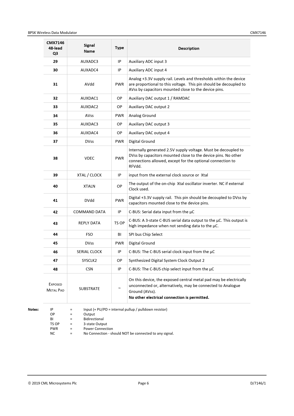 IP = Input (+ PU/PD = internal pullup / pulldown resistor) OP = Output BI = Bidirectional TS OP = 3-state Output PWR = Power Connection NC = No Connection - should NOT be connected to any signal.  2019 CML Microsystems Plc Page 6 D/7146/1 Document Outline Datasheet Front Page 1 Brief Description 1.1 History 2 Signal List 3 External Components 4 PCB Layout Guidelines and Power Supply Decoupling 5 General Description 5.1 CMX7146 Features 6 Detailed Descriptions 6.1 Xtal Frequency 6.2 Host Interface 6.2.1 C-BUS Operation 6.3 Function Image Loading 6.3.1 FI Loading from Host Controller 6.3.2 FI Loading from Flash/EEPROM 6.4 Device Control 6.4.1 Device Configuration (using the Programming Register) 6.4.2 Device Configuration (using dedicated registers) 6.4.3 Interrupt Operation 6.4.4 Signal Routing 6.4.5 Loading Transmit Data 6.4.6 The Transmit Sequence 6.4.7 Other Modem Modes 6.4.8 Data Transfer 6.4.9 Raw Data Transfer 6.4.10 Pre-loading transmit data 6.4.11 Auxiliary clock rates 6.4.12 Auxiliary data 6.4.13 GPIO Pin Operation 6.4.14 Auxiliary ADC Operation 6.4.15 Auxiliary DAC / RAMDAC Operation 6.5 Digital System Clock Generators 6.5.1 System Clock Operation 6.6 Signal Level Optimisation 6.7 C-BUS Register Summary 7 CMX7146 FI-1.x Features 7.1 Modulation 7.2 Radio Interface 7.3 Transmit Performance 8 Performance Specification 8.1 Electrical Performance 8.1.1 Absolute Maximum Ratings 8.1.2 Operating Limits 8.1.3 Operating Characteristics 8.1.4 Parametric Performance 8.2 C-BUS Timing 8.3 Packaging END OF DOCUMENT