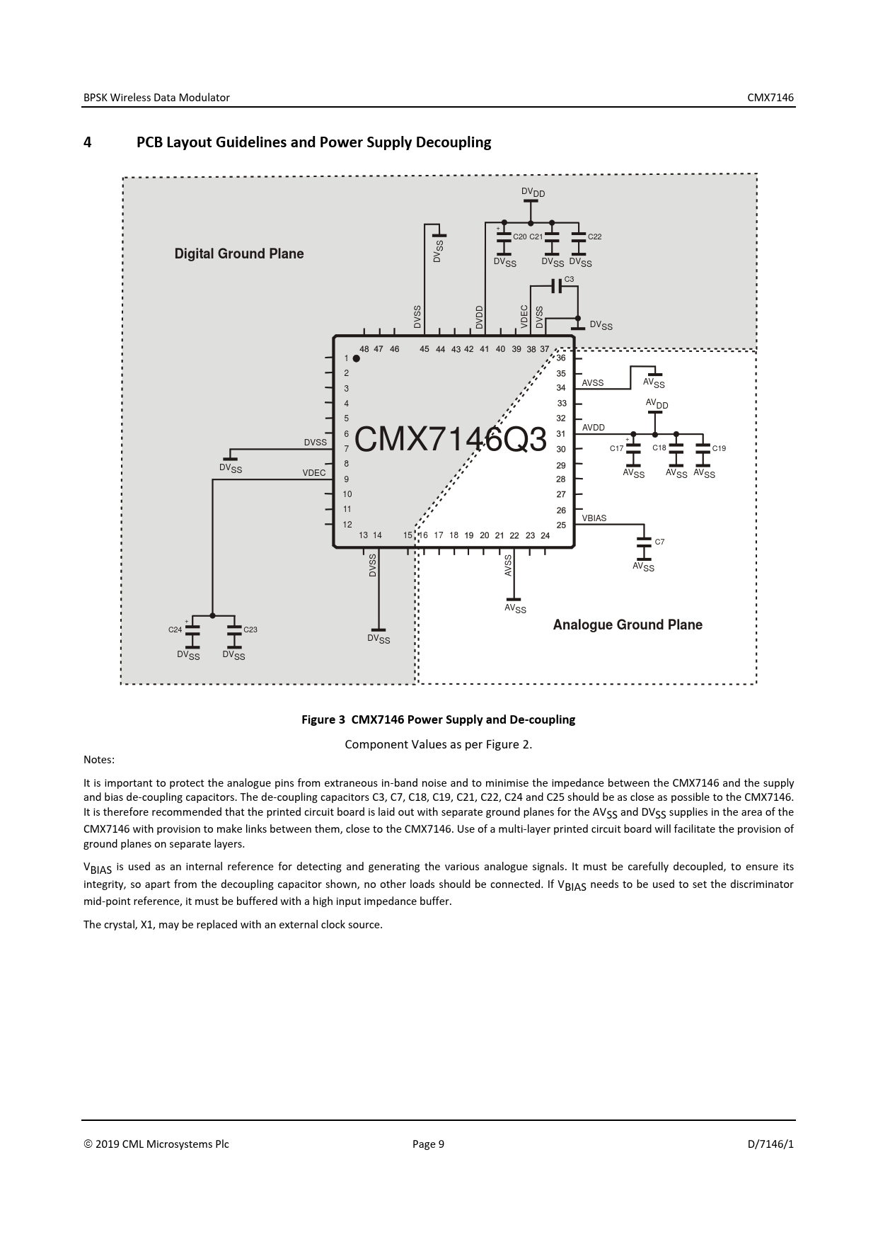 link to page 7 BPSK Wireless Data Modulator CMX7146 4PCB Layout Guidelines and Power Supply Decoupling DVDD + C20 C21 C22 S SV Digital Ground Plane D DVSS DVSS DVSS C3 S D C S S D E S V V D V D D V D DVSS 1 2 AVSS AVSS 3 4 AVDD 5 AVDD 6 DVSS + 7 CMX7146Q3 C17 C18 C19 DV 8 SS VDEC AVSS AVSS AVSS 9 10 11 VBIAS 12 13 14 15 16 17 18 C7 S S S S AV V V SS D A AVSS + Analogue Ground Plane C24 C23 DVSS DVSS DVSS Figure 3 CMX7146 Power Supply and De-coupling Component Values as per Figure 2. Notes: It is important to protect the analogue pins from extraneous in-band noise and to minimise the impedance between the CMX7146 and the supply and bias de-coupling capacitors. The de-coupling capacitors C3, C7, C18, C19, C21, C22, C24 and C25 should be as close as possible to the CMX7146. It is therefore recommended that the printed circuit board is laid out with separate ground planes for the AVSS and DVSS supplies in the area of the CMX7146 with provision to make links between them, close to the CMX7146. Use of a multi-layer printed circuit board will facilitate the provision of ground planes on separate layers. VBIAS is used as an internal reference for detecting and generating the various analogue signals. It must be carefully decoupled, to ensure its integrity, so apart from the decoupling capacitor shown, no other loads should be connected. If VBIAS needs to be used to set the discriminator mid-point reference, it must be buffered with a high input impedance buffer. The crystal, X1, may be replaced with an external clock source. 2019 CML Microsystems Plc Page 9 D/7146/1 Document Outline Datasheet Front Page 1 Brief Description 1.1 History 2 Signal List 3 External Components 4 PCB Layout Guidelines and Power Supply Decoupling 5 General Description 5.1 CMX7146 Features 6 Detailed Descriptions 6.1 Xtal Frequency 6.2 Host Interface 6.2.1 C-BUS Operation 6.3 Function Image Loading 6.3.1 FI Loading from Host Controller 6.3.2 FI Loading from Flash/EEPROM 6.4 Device Control 6.4.1 Device Configuration (using the Programming Register) 6.4.2 Device Configuration (using dedicated registers) 6.4.3 Interrupt Operation 6.4.4 Signal Routing 6.4.5 Loading Transmit Data 6.4.6 The Transmit Sequence 6.4.7 Other Modem Modes 6.4.8 Data Transfer 6.4.9 Raw Data Transfer 6.4.10 Pre-loading transmit data 6.4.11 Auxiliary clock rates 6.4.12 Auxiliary data 6.4.13 GPIO Pin Operation 6.4.14 Auxiliary ADC Operation 6.4.15 Auxiliary DAC / RAMDAC Operation 6.5 Digital System Clock Generators 6.5.1 System Clock Operation 6.6 Signal Level Optimisation 6.7 C-BUS Register Summary 7 CMX7146 FI-1.x Features 7.1 Modulation 7.2 Radio Interface 7.3 Transmit Performance 8 Performance Specification 8.1 Electrical Performance 8.1.1 Absolute Maximum Ratings 8.1.2 Operating Limits 8.1.3 Operating Characteristics 8.1.4 Parametric Performance 8.2 C-BUS Timing 8.3 Packaging END OF DOCUMENT