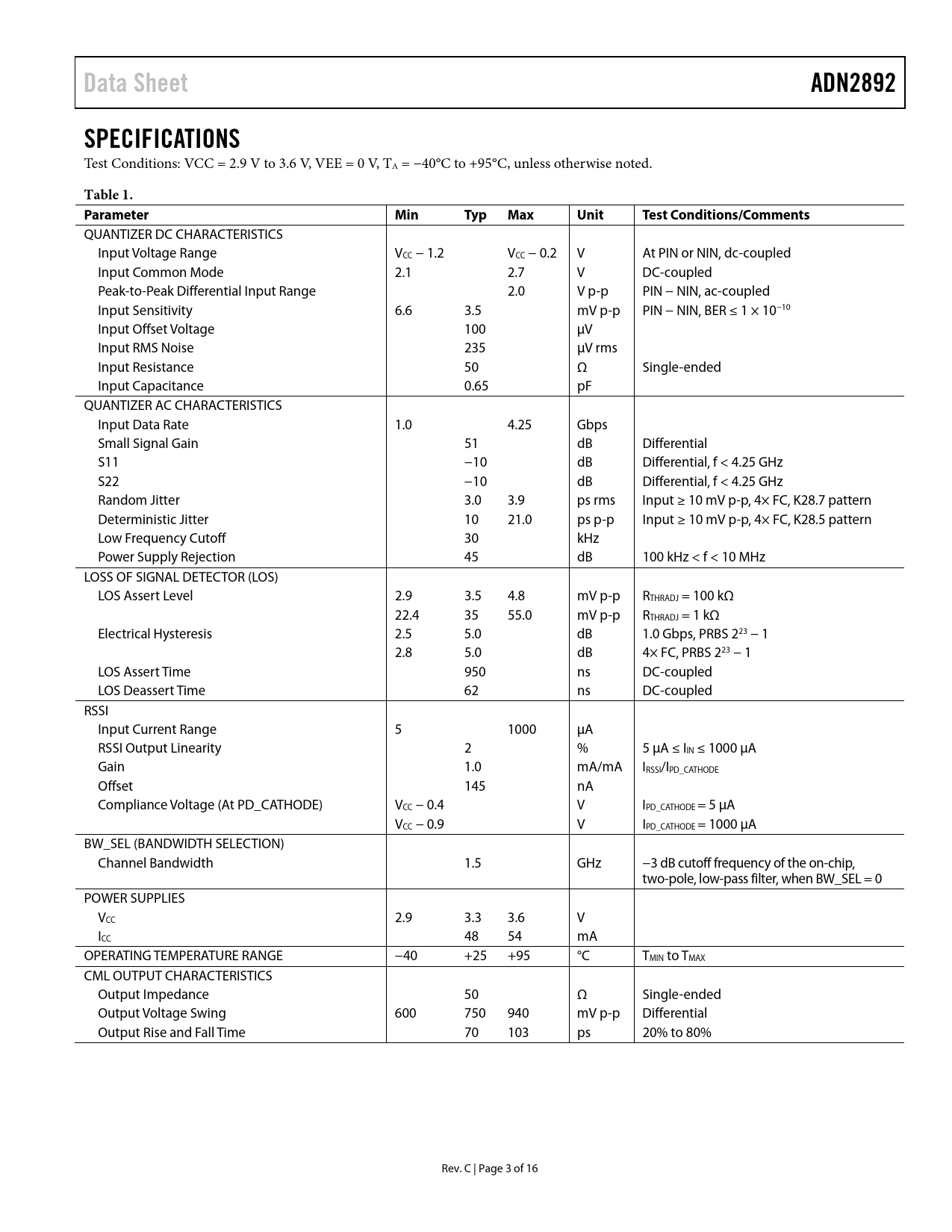 Data Sheet. ADN2892. SPECIFICATIONS. Table 1. Parameter. Min. Typ. Max. Unit. Test Conditions/Comments