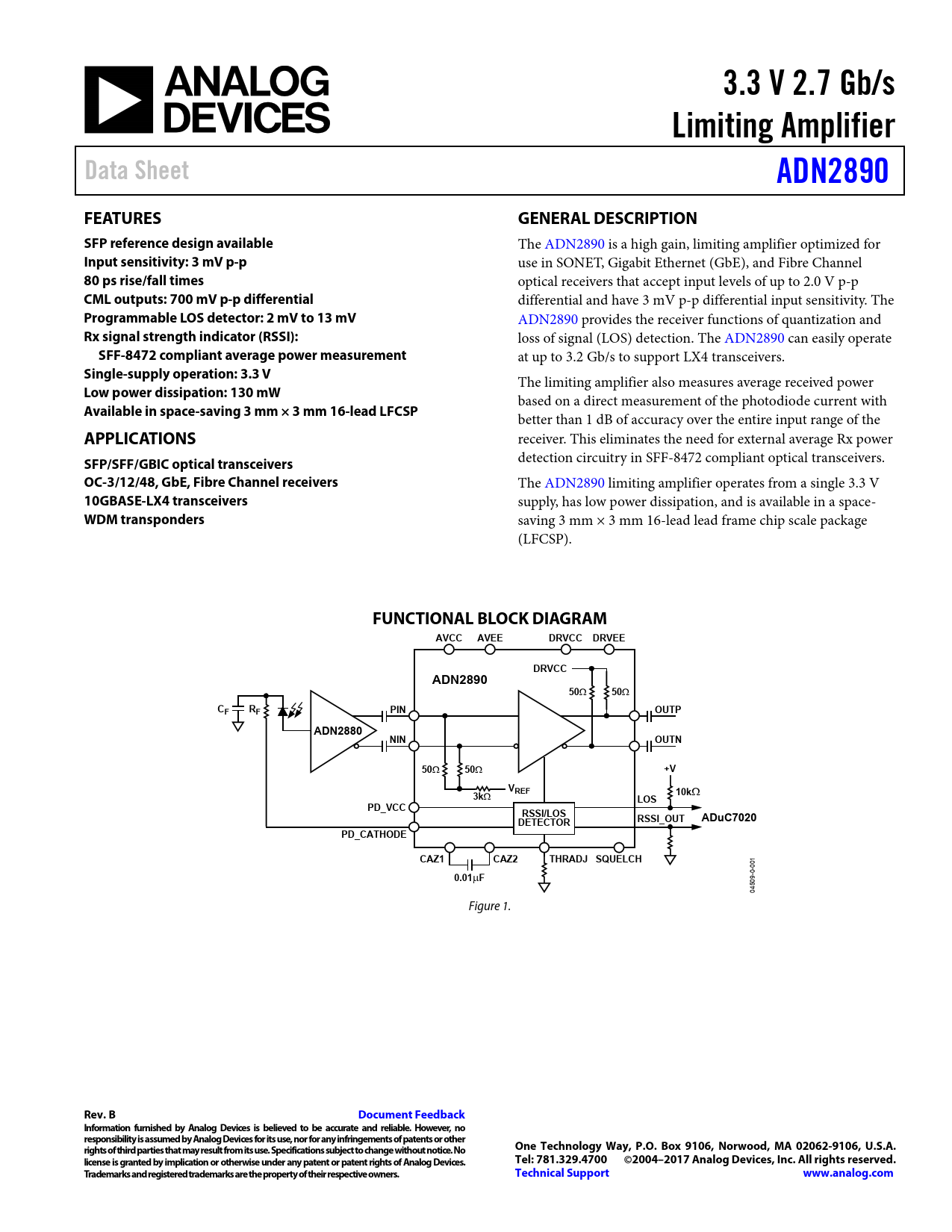 3.3 V 2.7 Gb/s. Limiting Amplifier. Data Sheet. ADN2890. FEATURES. GENERAL DESCRIPTION. SFP reference design available