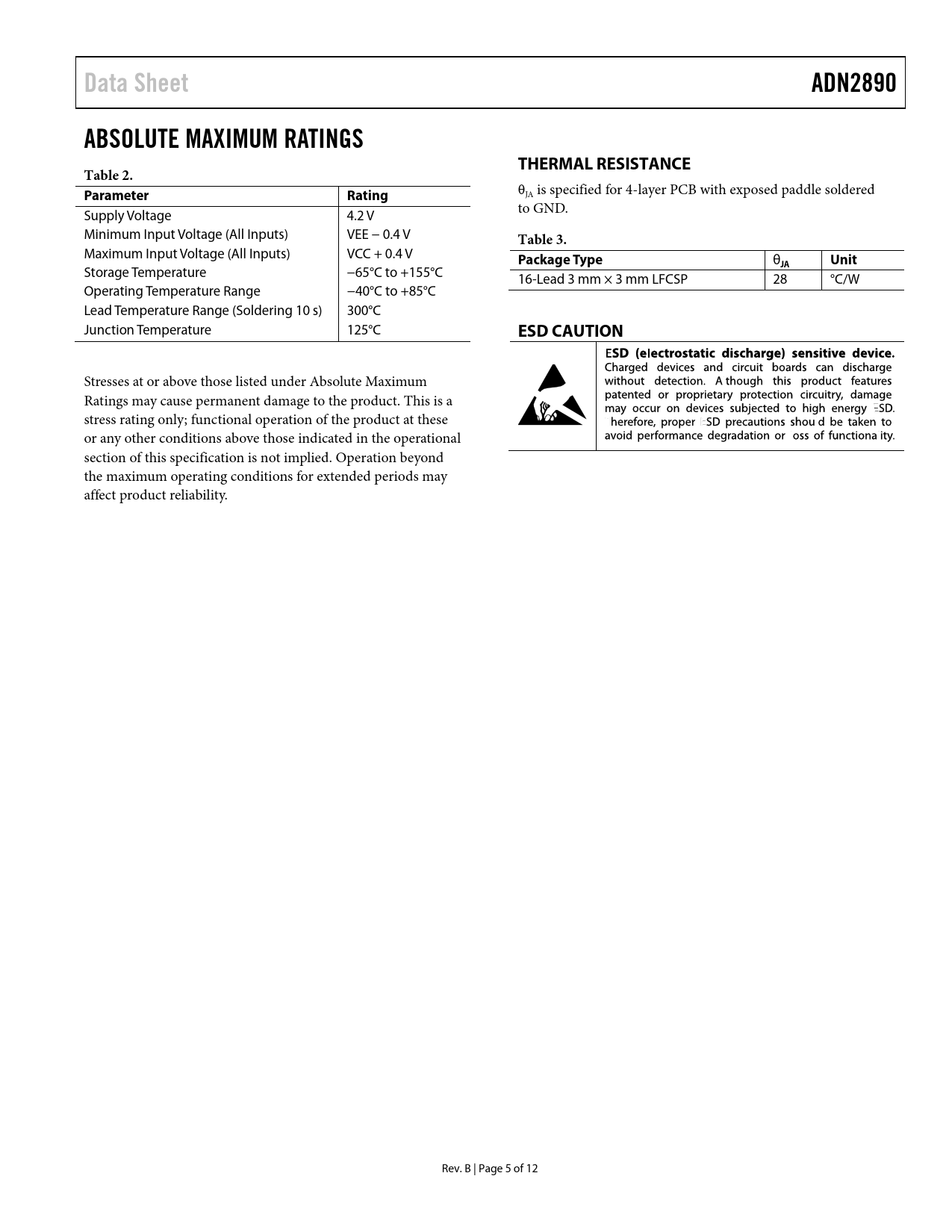 Data SheetADN2890ABSOLUTE MAXIMUM RATINGSTHERMAL RESISTANCETable 2. ParameterRating θJA is specified for 4-layer PCB with exposed paddle soldered Supply Voltage 4.2 V to GND. Minimum Input Voltage (All Inputs) VEE − 0.4 V Table 3. Maximum Input Voltage (All Inputs) VCC + 0.4 V Package Type θ Unit Storage Temperature −65°C to +155°C JA 16-Lead 3 mm × 3 mm LFCSP 28 °C/W Operating Temperature Range −40°C to +85°C Lead Temperature Range (Soldering 10 s) 300°C Junction Temperature 125°C ESD CAUTION Stresses at or above those listed under Absolute Maximum Ratings may cause permanent damage to the product. This is a stress rating only; functional operation of the product at these or any other conditions above those indicated in the operational section of this specification is not implied. Operation beyond the maximum operating conditions for extended periods may affect product reliability. Rev. B | Page 5 of 12 Document Outline FEATURES APPLICATIONS GENERAL DESCRIPTION FUNCTIONAL BLOCK DIAGRAM TABLE OF CONTENTS REVISION HISTORY SPECIFICATIONS ABSOLUTE MAXIMUM RATINGS THERMAL RESISTANCE ESD CAUTION PIN CONFIGURATION AND FUNCTION DESCRIPTIONS TYPICAL PERFORMANCE CHARACTERISTICS THEORY OF OPERATION LIMAMP Input Buffer CML Output Buffer LOSS OF SIGNAL (LOS) DETECTOR RECEIVED SIGNAL STRENGTH INDICATOR (RSSI) SQUELCH MODE APPLICATIONS INFORMATION PCB DESIGN GUIDELINES Power Supply Connections and Ground Planes PCB Layout Soldering Guidelines for Chip Scale Package OUTLINE DIMENSIONS ORDERING GUIDE NOTES