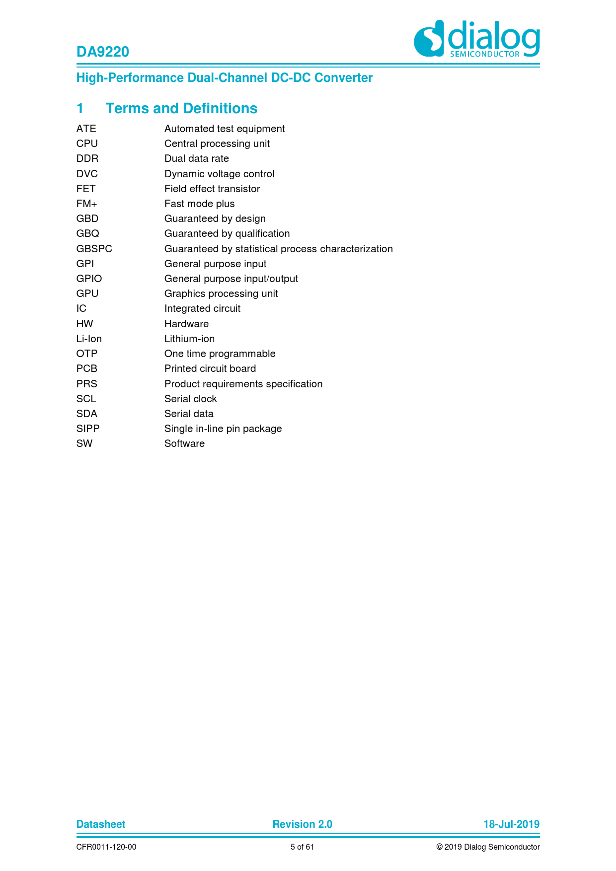 DA9220. High-Performance Dual-Channel DC-DC Converter. Terms and Definitions. Datasheet. Revision 2.0. 18-Jul-2019