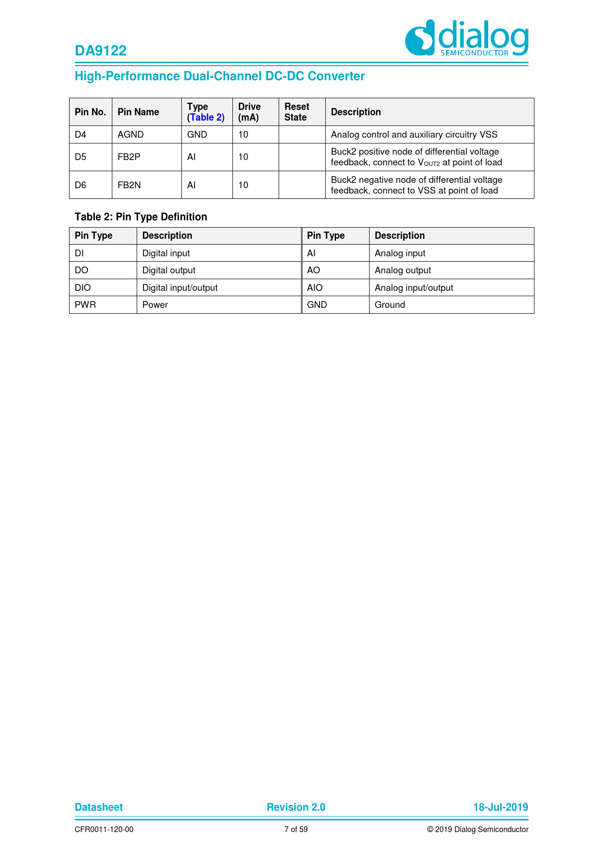 DA9122. High-Performance Dual-Channel DC-DC Converter. Type. Drive. Reset. Pin No. Pin Name. Description. (Table 2). (mA). State