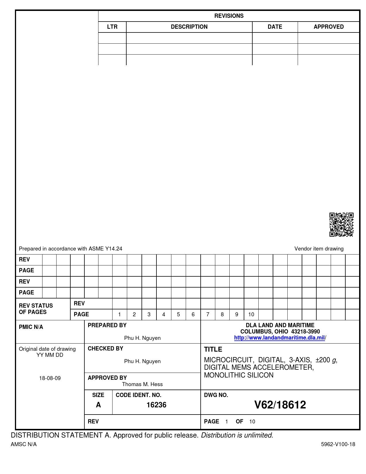 10 DISTRIBUTION STATEMENT A. Approved for public release. Distribution is unlimited. AMSC N/A 5962-V100-18 Document Outline DESCRIPTION REV REV PMIC N/A TITLE SIZE A V62/18612 REV
