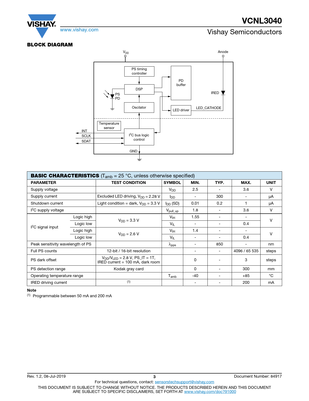 VCNL3040. BLOCK DIAGRAM. BASIC CHARACTERISTICS. PARAMETER. TEST CONDITION. SYMBOL. MIN. TYP. MAX. UNIT. Note