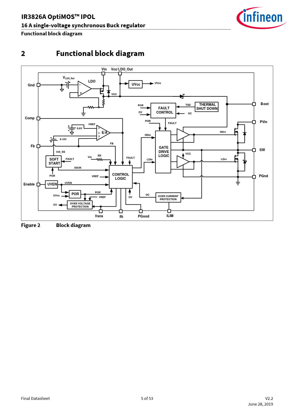 IR 8 A OptiMOS™ IPOL 16 A single-voltage synchronous Buck regulator Functional block diagram 2 Functional block diagram Vin Vcc/ LDO_Out VLDO_Ref LDO Gnd - UVcc UVcc + VCC Boot TSD POR THERMAL FAULT SHUT DOWN OV CONTROL OC Comp POR PVin FAULT VREF 0.6V + + E/A HDrv + HDin - 0.15V FB Fb GATE SW Intl_SS DRIVE VCC Rff LOGIC Vin SOFT FAULT FAULT LDin LDrv START SSOK CONTROL POR VREF PGnd LOGIC Enable UVEN UVEN POR POR UVcc OC VREF OV OVER CURRENT PROTECTION OVER VOLTAGE OV PROTECTION Vs ns Rt PGood ILIM Figure 2 Block diagram