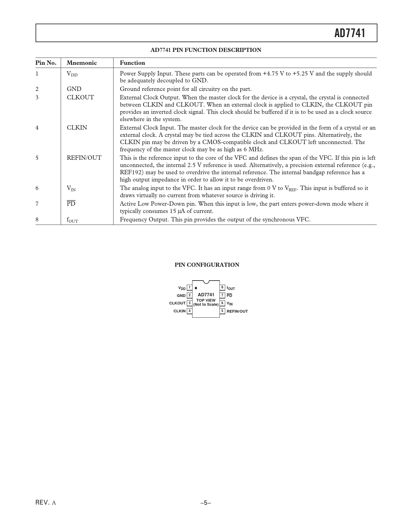 AD7741AD7741 PIN FUNCTION DESCRIPTIONPin No.MnemonicFunction 1 VDD Power Supply Input. These parts can be operated from +4.75 V to +5.25 V and the supply should be adequately decoupled to GND. 2 GND Ground reference point for all circuitry on the part. 3 CLKOUT External Clock Output. When the master clock for the device is a crystal, the crystal is connected between CLKIN and CLKOUT. When an external clock is applied to CLKIN, the CLKOUT pin provides an inverted clock signal. This clock should be buffered if it is to be used as a clock source elsewhere in the system. 4 CLKIN External Clock Input. The master clock for the device can be provided in the form of a crystal or an external clock. A crystal may be tied across the CLKIN and CLKOUT pins. Alternatively, the CLKIN pin may be driven by a CMOS-compatible clock and CLKOUT left unconnected. The frequency of the master clock may be as high as 6 MHz. 5 REFIN/OUT This is the reference input to the core of the VFC and defines the span of the VFC. If this pin is left unconnected, the internal 2.5 V reference is used. Alternatively, a precision external reference (e.g., REF192) may be used to overdrive the internal reference. The internal bandgap reference has a high output impedance in order to allow it to be overdriven. 6 VIN The analog input to the VFC. It has an input range from 0 V to VREF. This input is buffered so it draws virtually no current from whatever source is driving it. 7 PD Active Low Power-Down pin. When this input is low, the part enters power-down mode where it typically consumes 15 μA of current. 8 fOUT Frequency Output. This pin provides the output of the synchronous VFC. PIN CONFIGURATION18VDDfOUTGND 2AD77417PDTOP VIEWCLKOUT 3 (Not to Scale) 6 VINCLKIN 45REFIN/OUT REV. A –5–