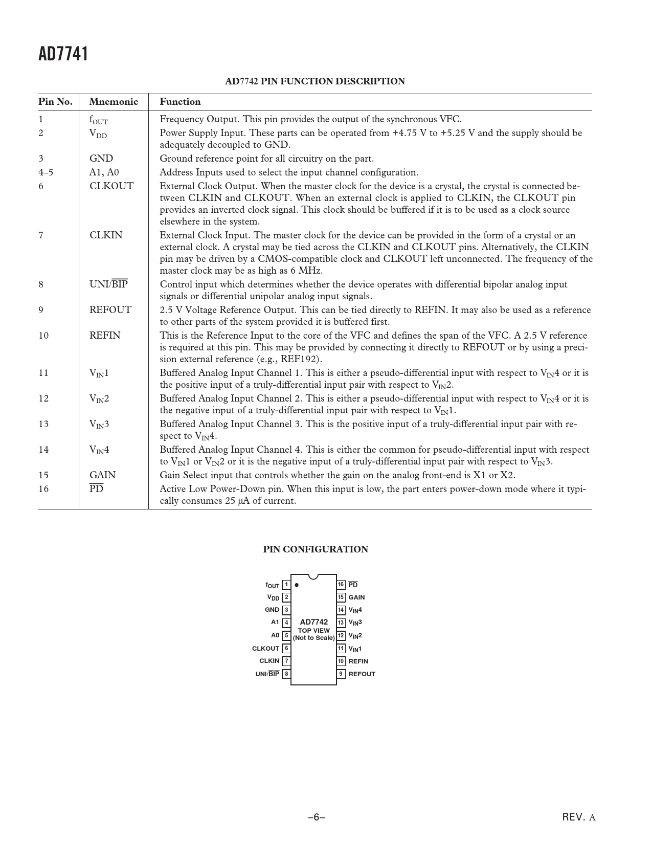 AD7741 AD7742 PIN FUNCTION DESCRIPTION Pin No. Mnemonic Function