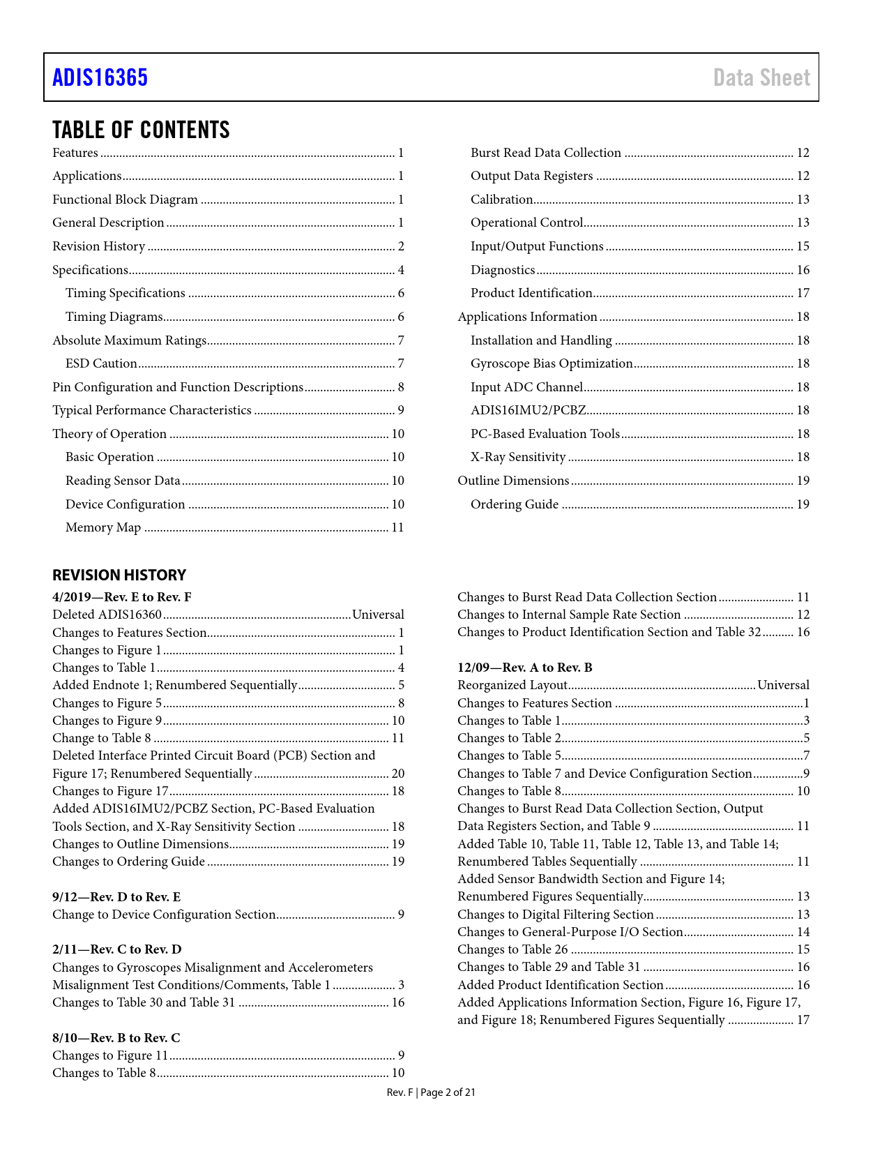 ADIS16365 Data Sheet TABLE OF CONTENTS REVISION HISTORY 4/2019—Rev E to Rev F 12/09—Rev A to Rev B 9/12—Rev D to Rev E