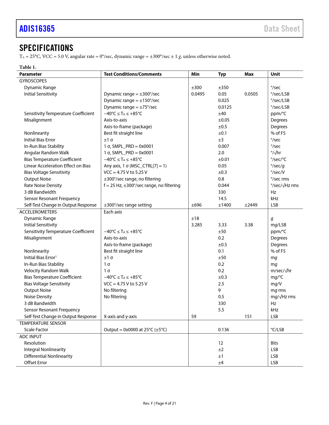 ADIS16365. Data Sheet. SPECIFICATIONS. Table 1. Parameter Test. Conditions/Comments. Min. Typ. Max. Unit