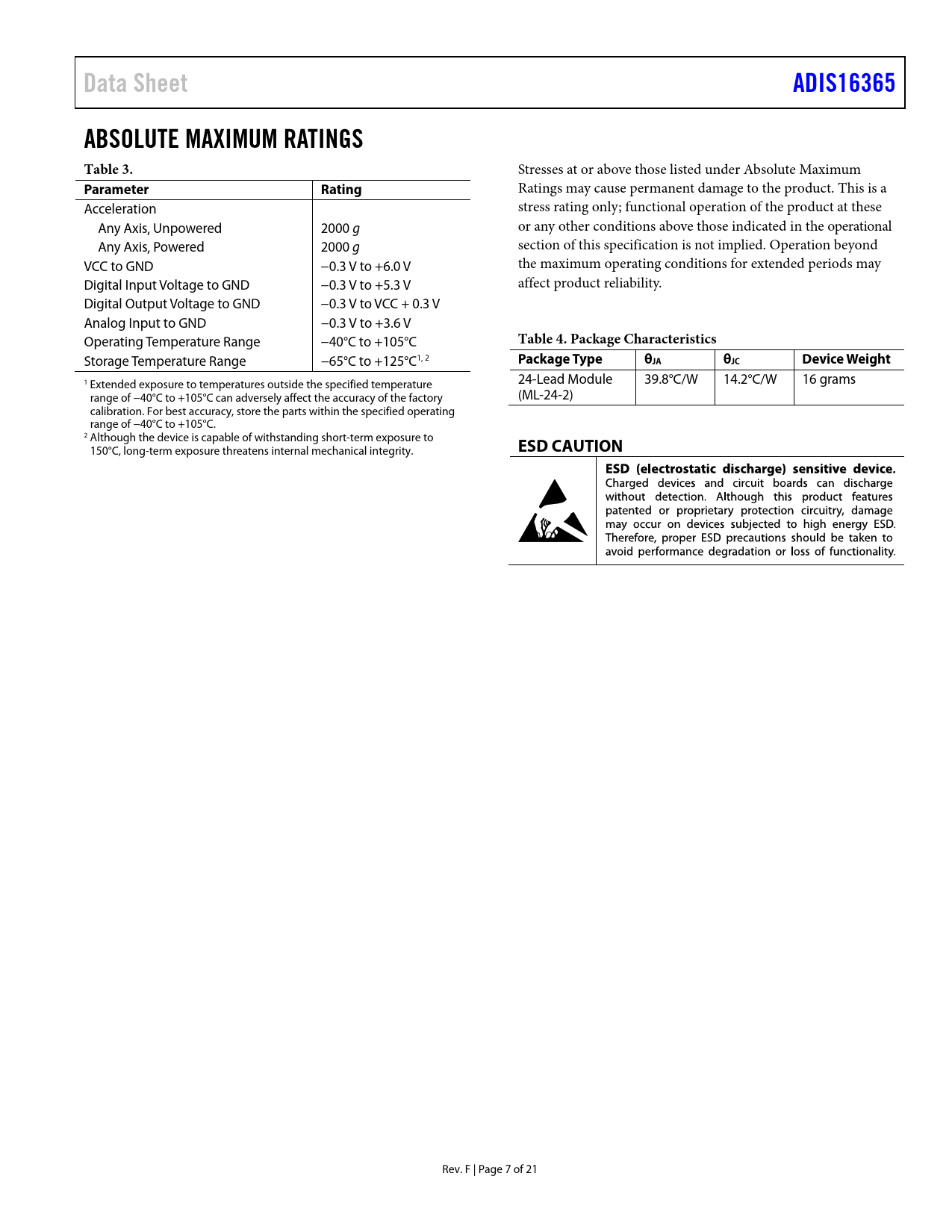 Data SheetADIS16365ABSOLUTE MAXIMUM RATINGS Table 3. Stresses at or above those listed under Absolute Maximum Parameter Rating Ratings may cause permanent damage to the product. This is a Acceleration stress rating only; functional operation of the product at these Any Axis, Unpowered 2000 g or any other conditions above those indicated in the operational Any Axis, Powered 2000 g section of this specification is not implied. Operation beyond VCC to GND −0.3 V to +6.0 V the maximum operating conditions for extended periods may Digital Input Voltage to GND −0.3 V to +5.3 V affect product reliability. Digital Output Voltage to GND −0.3 V to VCC + 0.3 V Analog Input to GND −0.3 V to +3.6 V Operating Temperature Range −40°C to +105°C Table 4. Package Characteristics Storage Temperature Range −65°C to +125°C1, 2 Package TypeθJAθJC DeviceWeight 1 24-Lead Module 39.8°C/W 14.2°C/W 16 grams Extended exposure to temperatures outside the specified temperature range of −40°C to +105°C can adversely affect the accuracy of the factory (ML-24-2) calibration. For best accuracy, store the parts within the specified operating range of −40°C to +105°C. 2 Although the device is capable of withstanding short-term exposure to 150°C, long-term exposure threatens internal mechanical integrity. ESD CAUTION Rev. F | Page 7 of 21 Document Outline FEATURES APPLICATIONS FUNCTIONAL BLOCK DIAGRAM GENERAL DESCRIPTION TABLE OF CONTENTS REVISION HISTORY SPECIFICATIONS TIMING SPECIFICATIONS TIMING DIAGRAMS ABSOLUTE MAXIMUM RATINGS ESD CAUTION PIN CONFIGURATION AND FUNCTION DESCRIPTIONS TYPICAL PERFORMANCE CHARACTERISTICS THEORY OF OPERATION BASIC OPERATION READING SENSOR DATA DEVICE CONFIGURATION MEMORY MAP BURST READ DATA COLLECTION OUTPUT DATA REGISTERS CALIBRATION Manual Bias Calibration Gyroscope Automatic Bias Null Calibration Gyroscope Precision Automatic Bias Null Calibration Restoring Factory Calibration Linear Acceleration Bias Compensation (Gyroscope) OPERATIONAL CONTROL Global Commands Internal Sample Rate Power Management Sensor Bandwidth Digital Filtering Dynamic Range INPUT/OUTPUT FUNCTIONS General-Purpose I/O Input Clock Configuration Data Ready I/O Indicator Auxiliary DAC DIAGNOSTICS Self-Test Memory Test Status Alarm Registers PRODUCT IDENTIFICATION APPLICATIONS INFORMATION INSTALLATION AND HANDLING GYROSCOPE BIAS OPTIMIZATION INPUT ADC CHANNEL PC-BASED EVALUATION TOOLS X-RAY SENSITIVITY OUTLINE DIMENSIONS ORDERING GUIDE