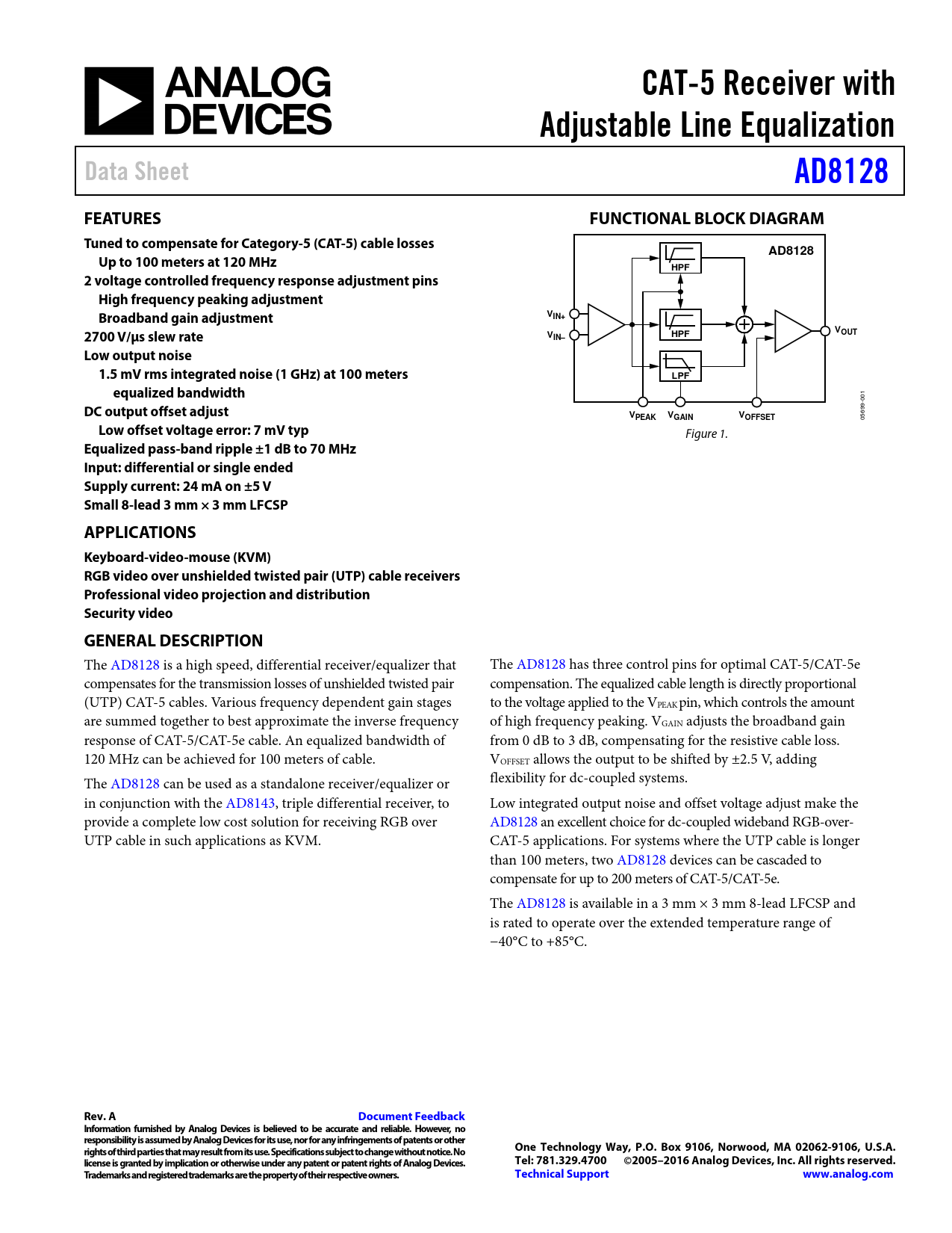 The AD8128 is a high speed, differential receiver/equalizer that The AD8128 has three control pins for optimal CAT-5/CAT-5e compensates for the transmission losses of unshielded twisted pair compensation. The equalized cable length is directly proportional (UTP) CAT-5 cables. Various frequency dependent gain stages to the voltage applied to the VPEAK pin, which controls the amount are summed together to best approximate the inverse frequency of high frequency peaking. VGAIN adjusts the broadband gain response of CAT-5/CAT-5e cable. An equalized bandwidth of from 0 dB to 3 dB, compensating for the resistive cable loss. 120 MHz can be achieved for 100 meters of cable. VOFFSET allows the output to be shifted by ±2.5 V, adding The AD8128 can be used as a standalone receiver/equalizer or flexibility for dc-coupled systems. in conjunction with the AD8143, triple differential receiver, to Low integrated output noise and offset voltage adjust make the provide a complete low cost solution for receiving RGB over AD8128 an excellent choice for dc-coupled wideband RGB-over- UTP cable in such applications as KVM. CAT-5 applications. For systems where the UTP cable is longer than 100 meters, two AD8128 devices can be cascaded to compensate for up to 200 meters of CAT-5/CAT-5e. The AD8128 is available in a 3 mm × 3 mm 8-lead LFCSP and is rated to operate over the extended temperature range of −40°C to +85°C.