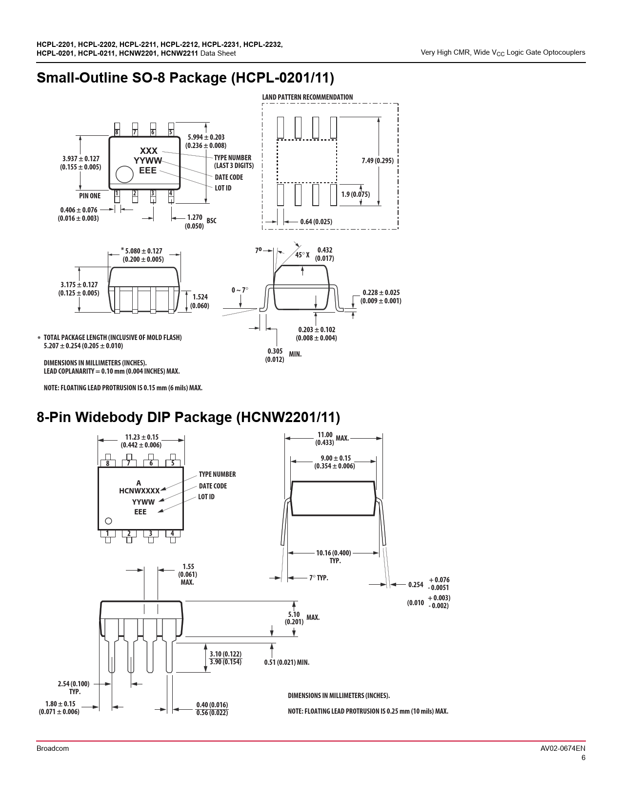 Broadcom AV02-0674EN 6 Document Outline Description Features Applications Functional Diagram Selection Guide Schematic Ordering Information Package Outline Drawings 8-Pin DIP Package (HCPL-2201/02/11/12/31/32) 8-Pin DIP Package with Gull Wing Surface Mount Option 300 (HCPL-2201/02/11/12/31/32) Small-Outline SO-8 Package (HCPL-0201/11) 8-Pin Widebody DIP Package (HCNW2201/11) 8-Pin Widebody DIP Package with Gull Wing Surface Mount Option 300 (HCNW2201/11) Solder Reflow Profile Regulatory Information Insulation and Safety Related Specifications IEC/EN/DIN EN 60747-5-5 Insulation Characteristics (Option 060) IEC/EN/DIN EN 60747-5-5 Insulation Characteristics (HCNW22xx Option 060 ONLY) Absolute Maximum Ratings Recommended Operating Conditions Electrical Specifications Switching Specifications (AC) Package Characteristics