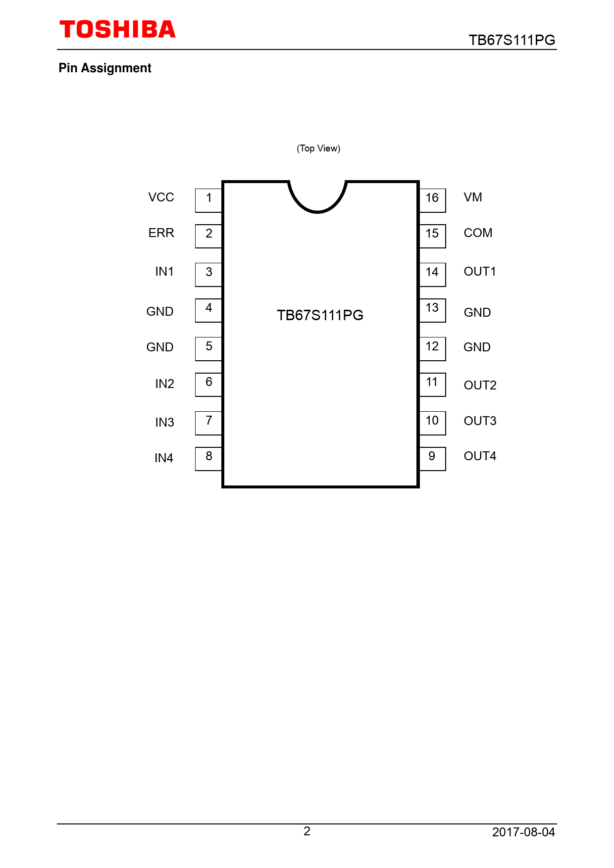 (Top View) VCC 1 16 VM ERR 2 15 COM IN1 3 14 OUT1 4 13 GND GND TB67S111PG GND 5 12 GND IN2 6 11 OUT2 IN3 7 10 OUT3 IN4 8 9 OUT4 2 2017-08-04