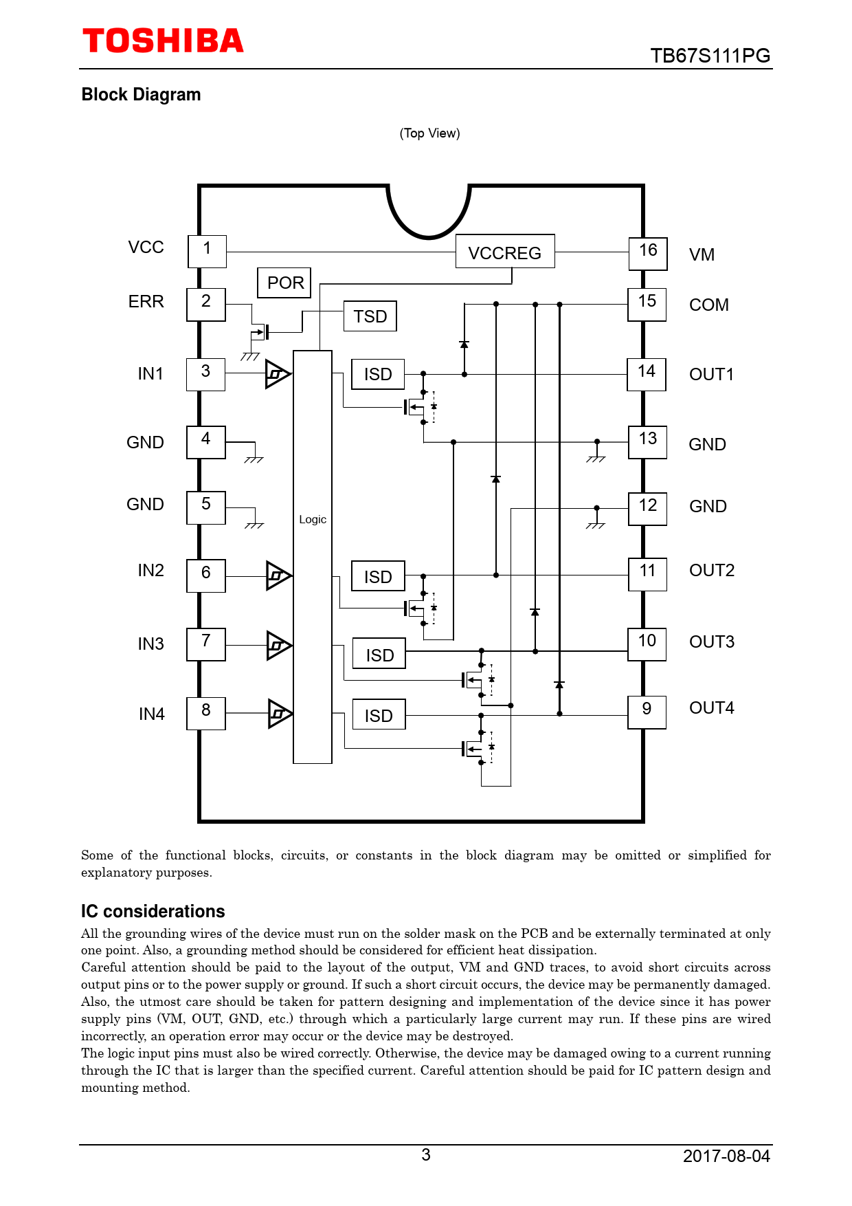 (Top View) VCC 1 VCCREG 16 VM POR ERR 2 15 COM TSD IN1 3 ISD 14 OUT1 GND 4 13 GND GND 5 12 GND Logic IN2 11 OUT2 6 ISD IN3 7 10 OUT3 ISD 9 OUT4 IN4 8 ISD Some of the functional blocks, circuits, or constants in the block diagram may be omitted or simplified for explanatory purposes.